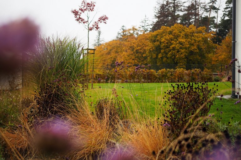 Zahrada rodinného domu ležící v kopcích nad Blanskem. Les a kulisa stromů přímo za plotem je tu prvkem, který silně dokresluje dojem z celého místa a spolu se zahradou jsou působivými i v deštivém podzimním dni, ve kterém byly pořízeny snímky v galerii.