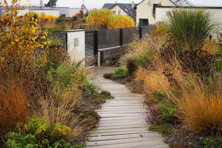 Předzahrádka je řešena jako divoký trvalkový záhon s výrazným podílem trav, které zajišťují dynamičnost celého prvku. Trávy jsou doplněny o trvalky okrasné květem, které zajišťují atraktivnost po celé vegetační období. Aby byl záhon působivým prvkem i v časných jarních měsících, kdy jsou staré listy travin odstraněny a čeká se na ty nové, je zde vysázeno velké množství cibulovin.