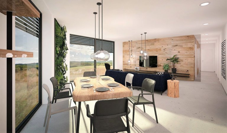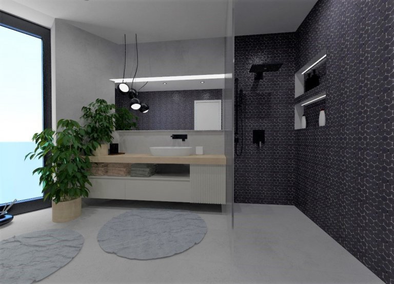 Inteirér je navržen v minimalistickém stylu, kde se skloubí tóny šedé a bílé. Na podlaze pro sjednocení a čistotu prostoru bude epoxidová stěrka, doplňkově jsou navžené kontrastní černé minimalistické kusy nábytku, jako jsou ocelové police. Pro zateplení a zútulnění zde pracujeme s obkladem hlavní stěny pomocí masivní dřevěné dubové podlahy a výrazným prvkem je vertikální zahrada.