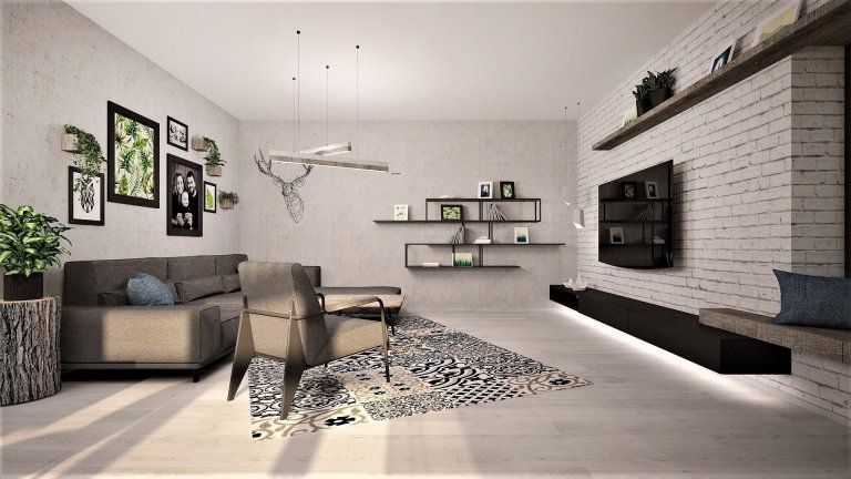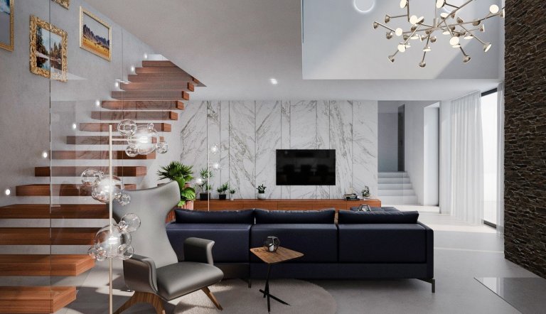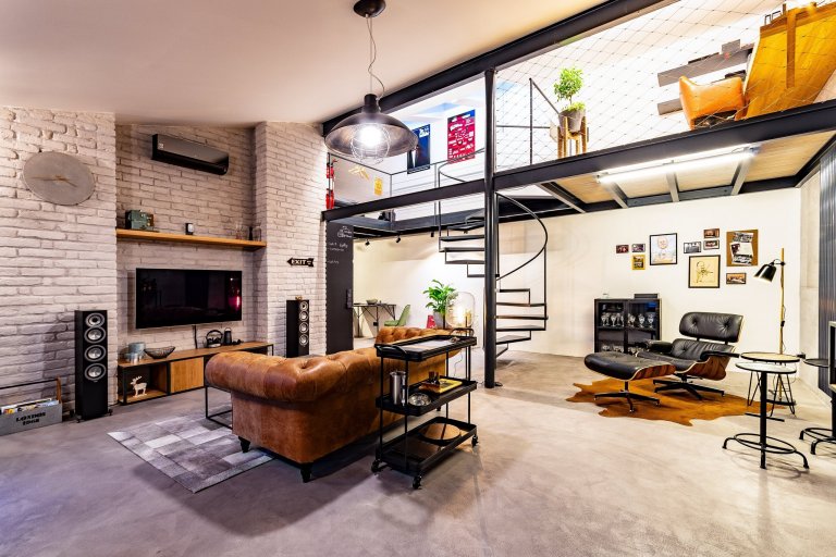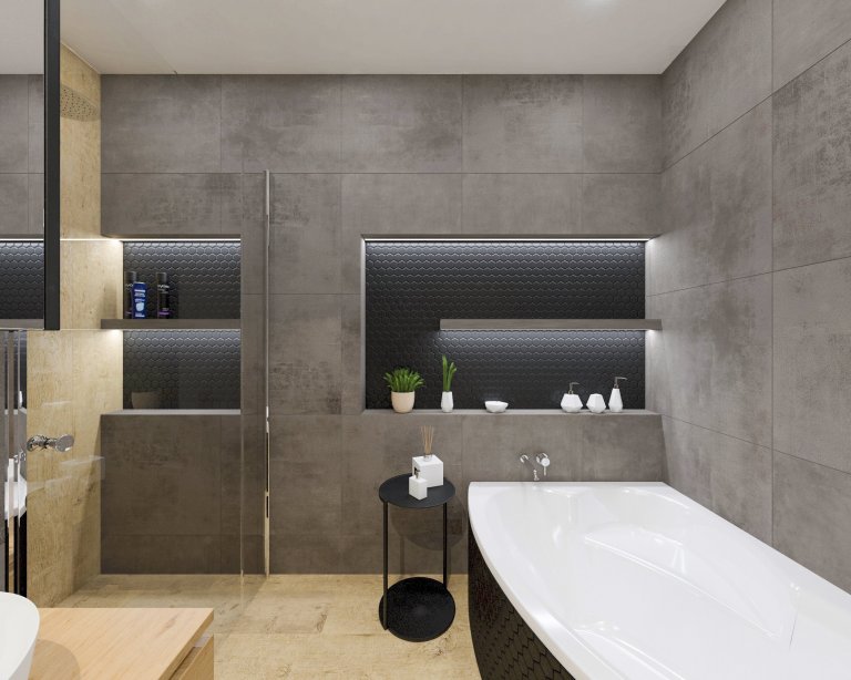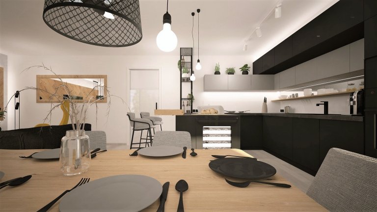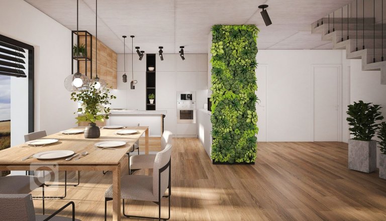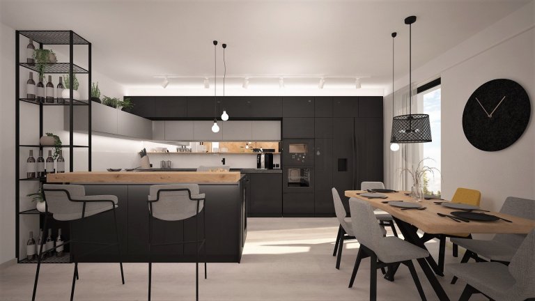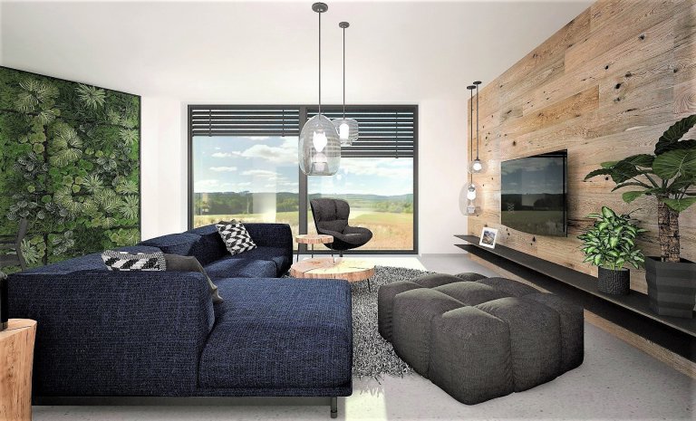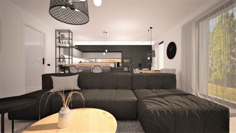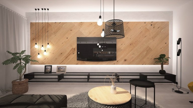 Interiér novostavby rodinného domu pro mladý manželský pár, který miluje industriální styl, kontrast a dřevo dub.