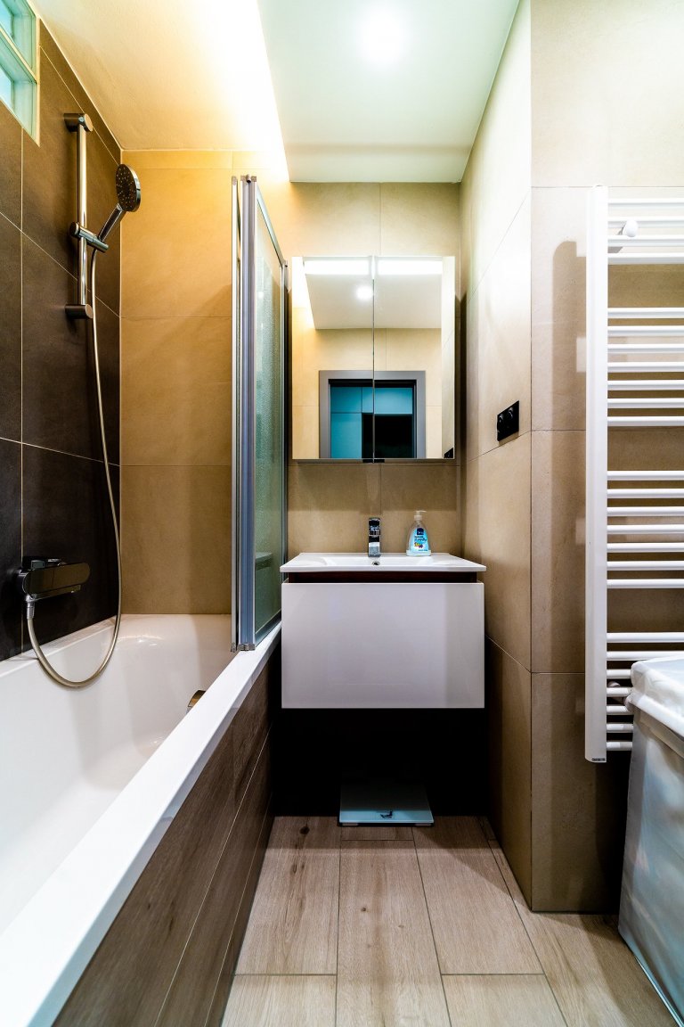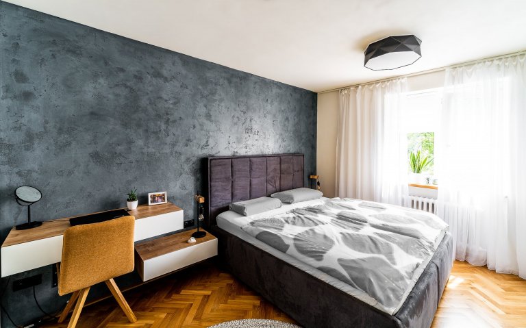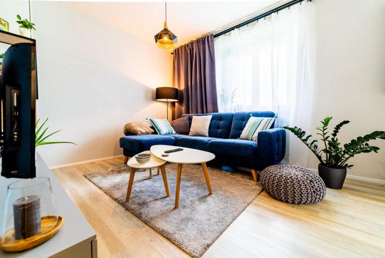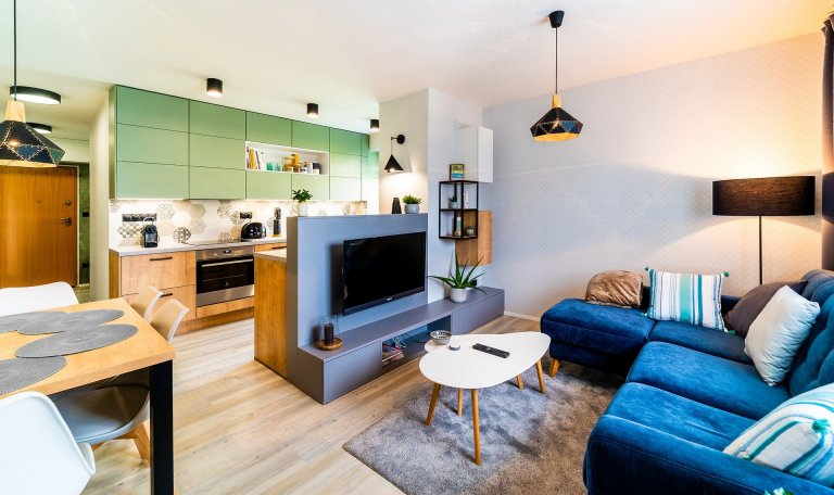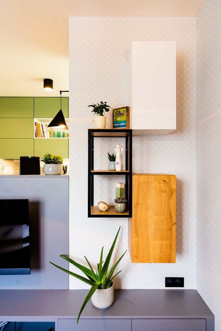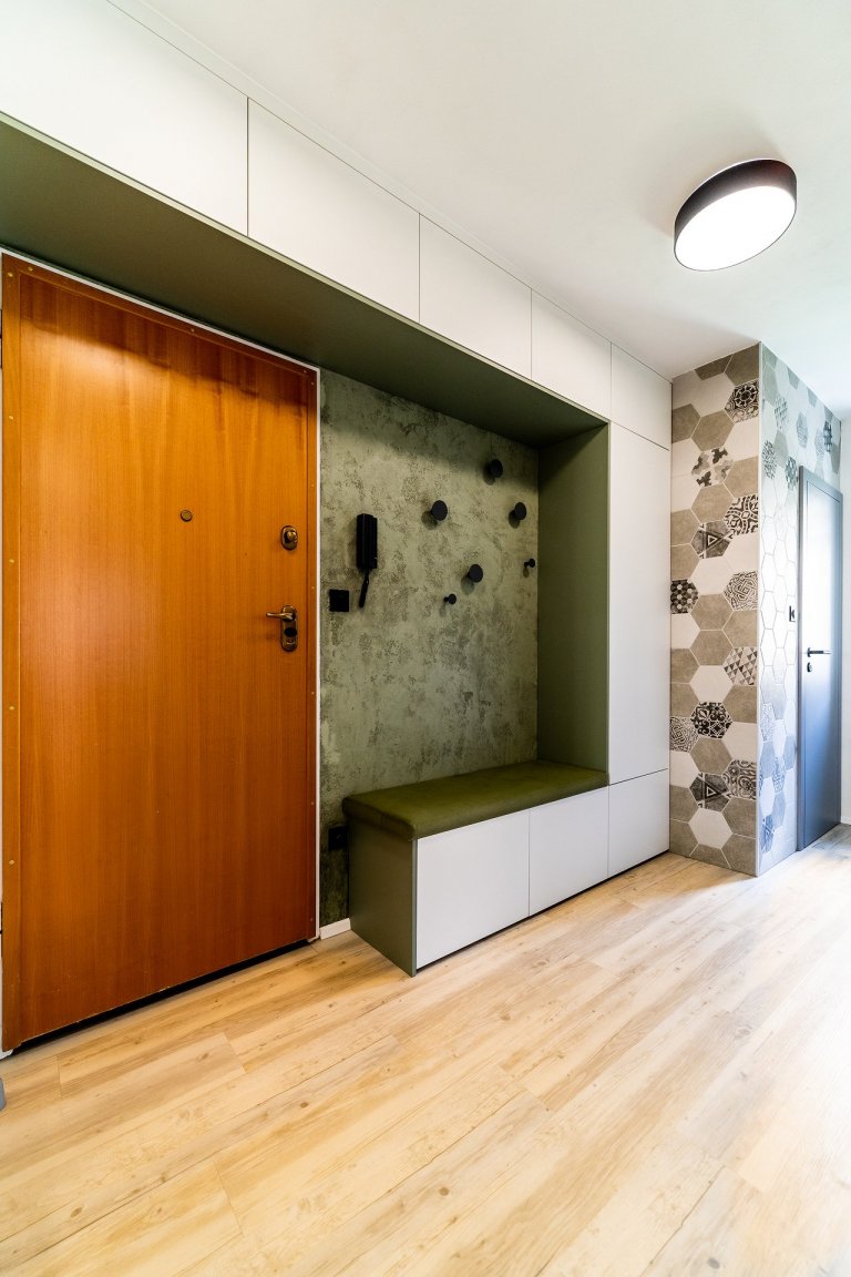 Rekonstrukce bytu pro mladý sympatický pár který se nebojí barev. Interiér je skloubením požadavků investorů, kteří milují kombinaci šalvějově zelené a námořnicky modré barvy. Lehké industriální prvky kovových konstrukcí jsou doplněny nábytkem, který má tvary a nádech skandinávského stylu. Interiérem se prolíná prvkek šestiúhelníku, který je napetě, na obkladech a na osvětlení. Z malé koupelny jsme vytáhli maximum a nabízí jak komfortní umyvadlo se zrcadlovou skříňkou, tak vanu se sprchovým prostorem a naproti pračku.