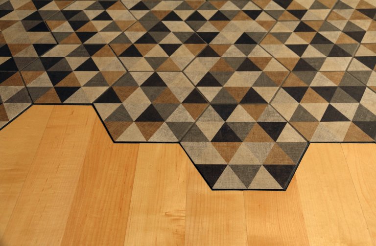 Výrazným výtvarným prvkem je pás nově dlážděné podlahy. Použit je vzor kombinující výše uvedené barevné odstíny ve formě trojúhelníků, který je jakousi soudobou interpretací tradičních ornamentů.