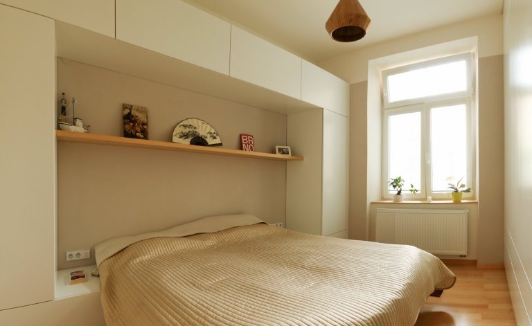 Navržený nábytek je zhotoven na míru, v laku s odstínem lomené bílé, tak, aby hmota nábytku pocitově nezatěžovala prostory interiéru. V každé místnosti je pak použit horizontální akcent v odstínu přírodního dřeva, zpravidla ve formě polic a parapetů.