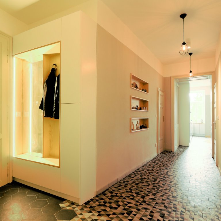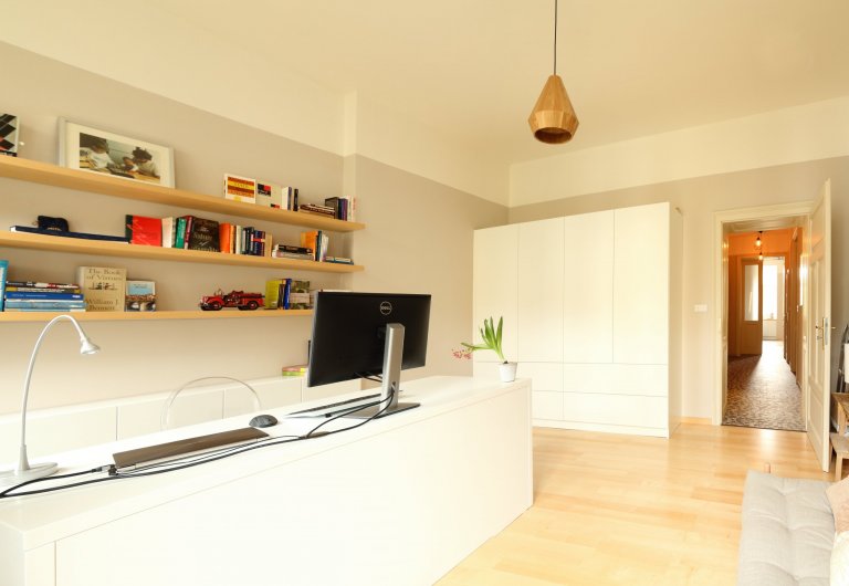 Byt se nachází ve třetím podlaží bytového domu z r. 1906 a má severojižní orientaci (jih - ulice, sever - vnitroblok). Cílem úprav bylo přeorganizování dispozice tak, aby mohla být vytvořena plnohodnotná společenská zóna bytu a život obyvatel bytu se mohl koncentrovat v jednom místě, namísto roztříštěného fungování na trase kuchyně - chodba - obývací pokoj. Stejně důležitým úkolem bylo přeřešení ložnice za účelem lepšího provázání s hygienickým zázemím a v neposlední řadě vytvoření pracovny kombinované s prostorem pro občasné hosty.