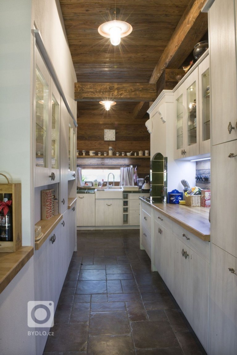 Vlevo sklad potravin, vpravo pracovní plocha, vzadu mycí centrum