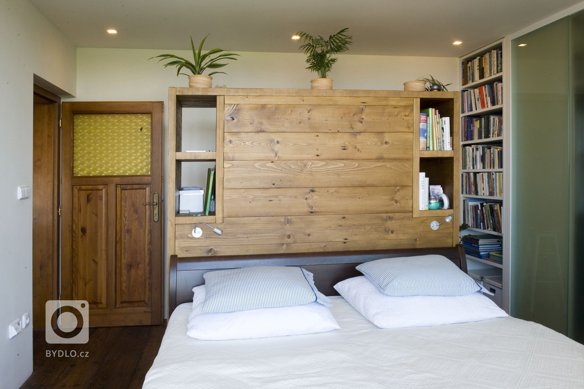 Záda postele mimo jiné cloní vstup do koupelny