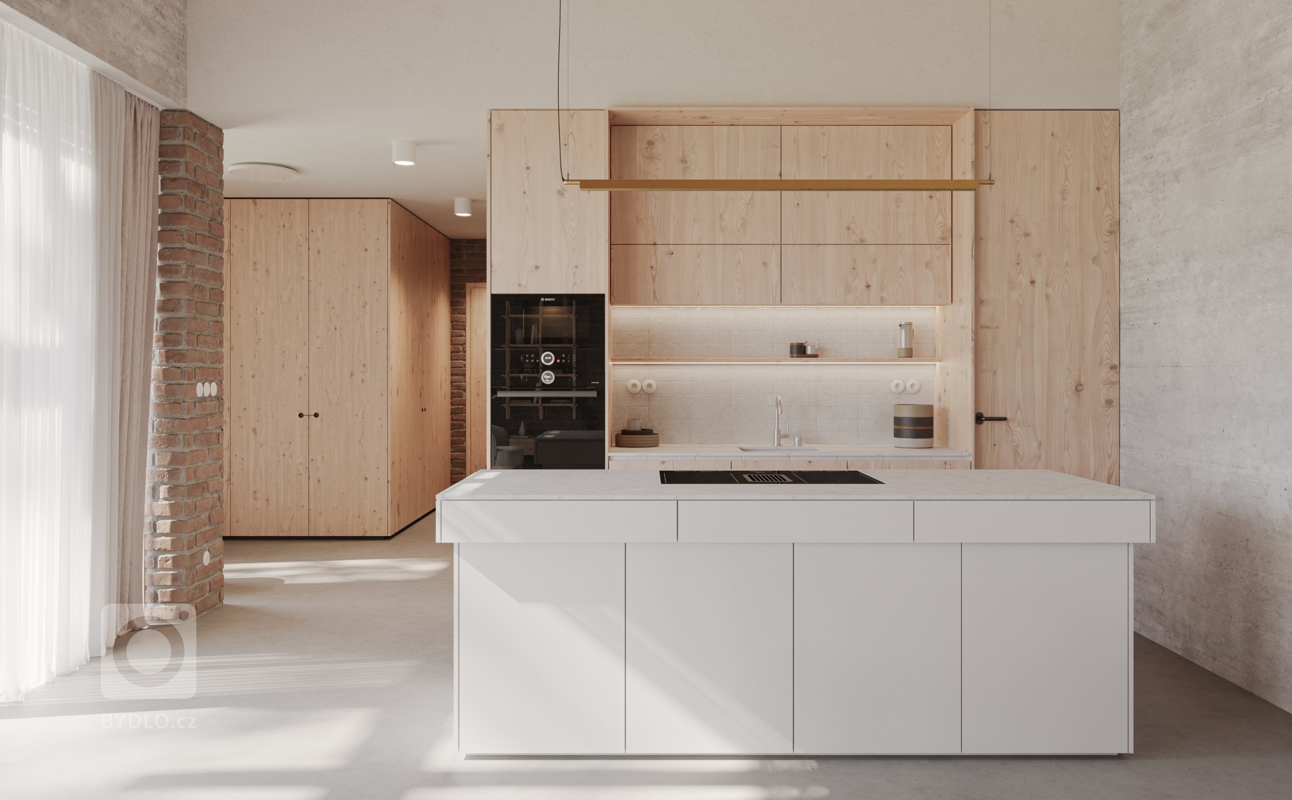 Dominantným priestorom dispozície je otvorená obývacia časť s kuchyňou a jedálňou, s výškou až po priznaný drevený krov. Nachádza sa tu vstupná predsieň, v kontakte s ňou je hosťovská izba, kúpeľňa s wc a technická miestnosť. Nasleduje centrálny otvorený priestor s kuchyňou, jedálenskou časťou a obývacím priestorom. Za kuchyňou sa nachádza komora. Centrálny obytný priestor je otvorený smerom do záhrady a tak opticky prepojený s okolitým prírodným prostredím. Z kuchynskej časti je prístupná terasa s exteriérovým posedením a tieniacou pergolou. Nábytkové prvky z bielenej smrekovej biodosky podporujú prírodný koncept. Obvodový plášť z konopného betónu vytvára štruktúrované zvislé plochy s charakteristickou textúrou. Prirodzená farebnosť a pravdivosť materiálov sa odráža aj v samotných izbách v podobe odhalených tehlových priečok, konopného betónu či smrekovej biodosky.