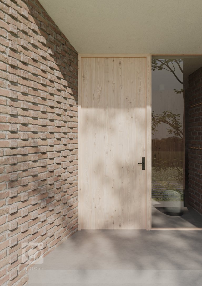 Dominantným priestorom dispozície je otvorená obývacia časť s kuchyňou a jedálňou, s výškou až po priznaný drevený krov. Okolo nej sa z oboch strán za sebou radia obytné izby a hygienické priestory. Obytné izby sú navrhované iba na prízemí. Nachádza sa tu vstupná predsieň v minimalistickom prevedení so šatníkom zo smrekovej biodosky a priznaných tehlových stien. Závetrie vstupnej časti je naviac doplnené o priestorový vzor kladenia tehly, ktorý vnáša na fasádu potrebný akcent.