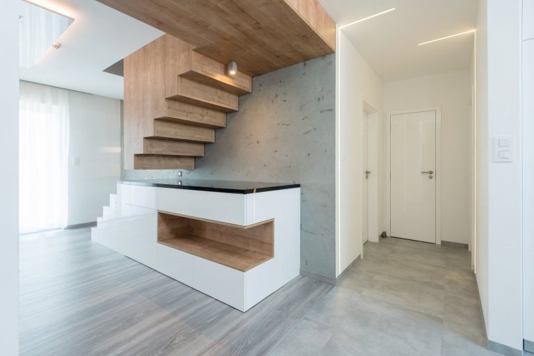 Mestská časť Bratislava – Rača je súčasťou tretieho Bratislavského obvodu. Je známa predovšetkým svojimi bohatými vinohradníckymi tradíciami. Atraktivitou tohto prostredia je blízkosť viníc ale aj lesov Malých Karpát, ktoré dotvárajú scenériu okolitej architektúry. Jedným z charakterov tejto časti sú aj sedlové strechy na starších bytovkách, ktoré prechádzajú rekonštrukciami a zmenou využitia pre účel bývania. Podkrovný mezonet je príkladom bývania v tejto štvrti. Znížený strop a šikminy sú často obmedzením vyplývajúci z navrhnutej konštrukcie nadstavby a strechy domu. V takomto prípade treba zohľadňovať interiér pre maximálne využitie štandardom rodiny. Úložný priestor, technológie a jednoduchá údržba interiéru sú požiadavkou súčasnosti. Takmer každý detail má funkčné a praktické opodstatnenie. Vzdušnosť, svetlosť a estetika je docielená použitím prírodných odtieňov. Betónová štruktúra omietky v kombinácií s bielou, sivou a dubom vytvárajú grafiku interiéru. Povrch materiálov je lesklý a matný. Výrazným prvkom je schodisko vytvorené z dvoch častí nábytku. Zámerom rozdelenia schodiska na dve časti bolo spojenie funkcie úložného priestoru pod schodiskom ako aj zábradlia. Iné zloženie prechodu medzi dvoma úrovňami bytu umožní vytiahnuť obyvateľa ako aj návštevníka zo sveta rutiny.