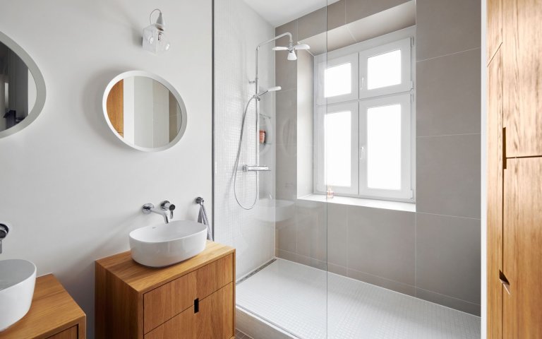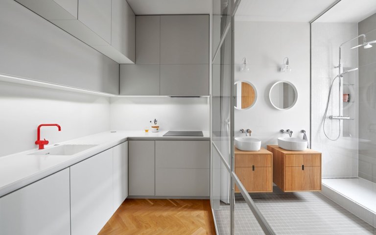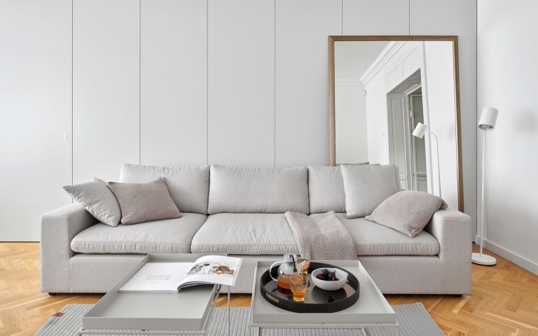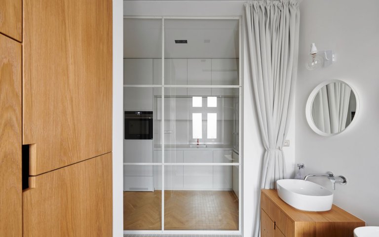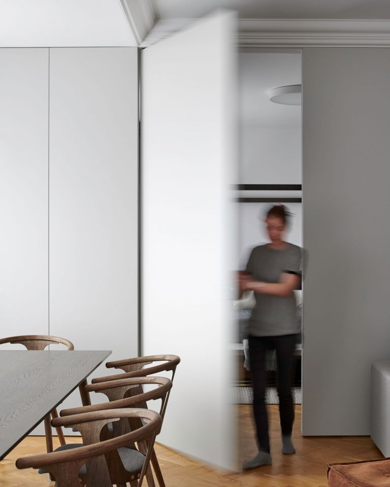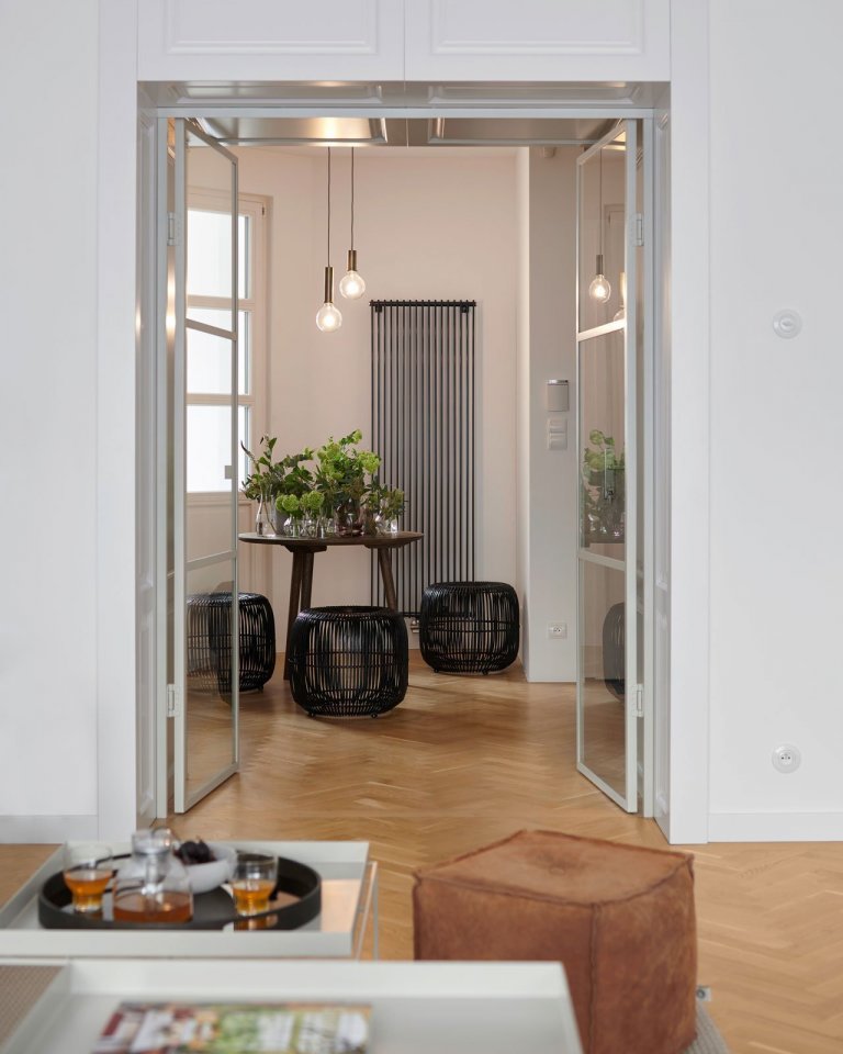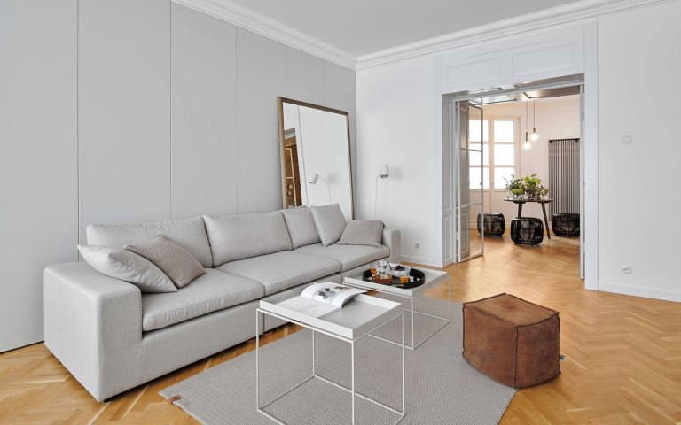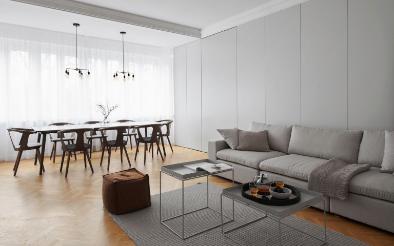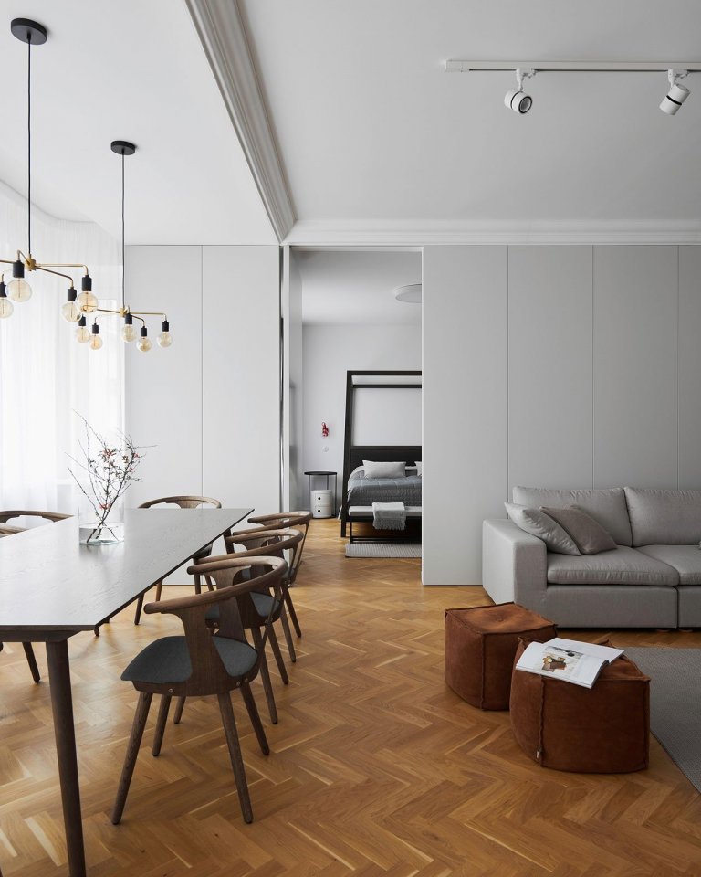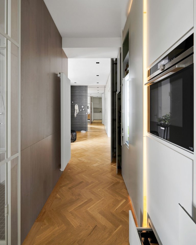 Ako prepojenie s pôvodným vzhľadom bytu sme použili najmä krásnu stromčekovú dubovú podlahu a kazetové obloženie. Nejedná sa však o originálne prvky zo starého interiéru. Drevená podlaha aj kazety boli nanovo vyrobené na mieru.
