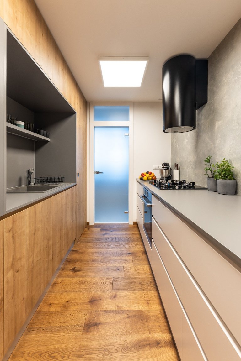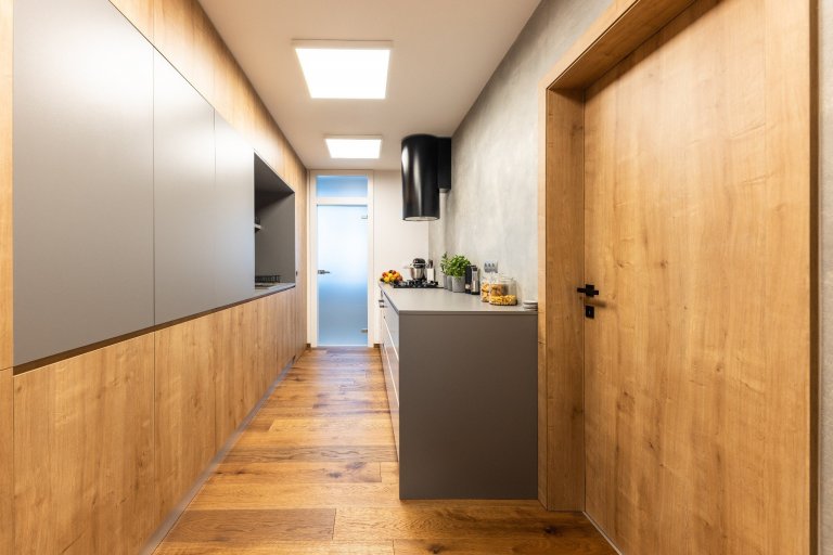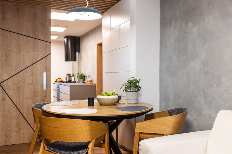 manželský pár s dvoma deťmi už dlhšie uvažovali nad zmenou. dlhodobo bývali v trojizbovom byte, kde všetci oceňovali blízkosť centra mesta. vhodný rodinný dom sa im nepodarílo nájsť a preto sa rozhodli pre ráznu rekonštrukciu svojho súčasného bytu. najzákladnejšou zmenou bola pre majiteľov dispozičná zmena bytu, nakoľko priveľká nevyužiteľná hala a hlavne neusporiadaný denný priestor. malá kuchyňa bola totiž umiestnená na opačnej strane bytunež obývačka. majiteľom sme navrhli tri varianty nového usporiadania, pričom si zvolii možnosť prepojeného denného priestoru v jednej línií s nadväznosťou na balkón. kuchyňa a chodba sa dajú od priestoru obývačky oddeliť masívnymi dverami s geometrickým zárezom. kuchyňu od predsiene oddeľuje vstavaný nábytkový blok, ktorý z jednej strany tvorí kuchynskú linku a z druhej úložný priestor v predsieni. koncept detskej izby nadväzuje na celý interiér, avšak samotný dizajn bol prispôsobený najmladšej dcére, nakoľko starší syn sa už u rodičov často nezdržiava. izba je však prispôsobená obom súrodencom, počíta dokonca aj s návštevami. dlhý stôl a veľký šastník s vyklápacou posteľou poskytujú dostatok priestoru pre všetkých. publikácia v môjdom 02/2022