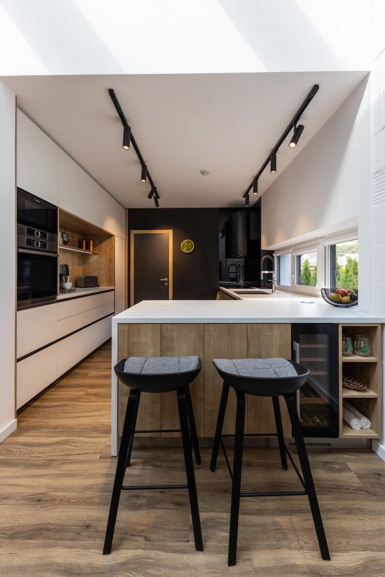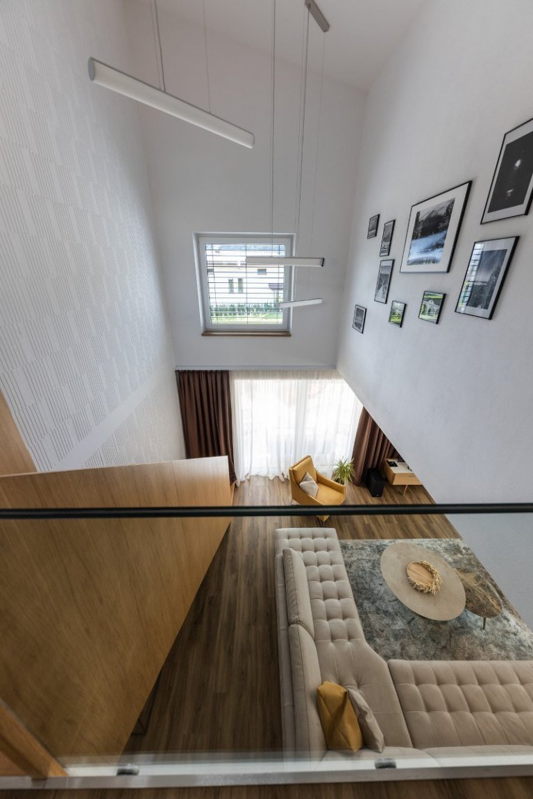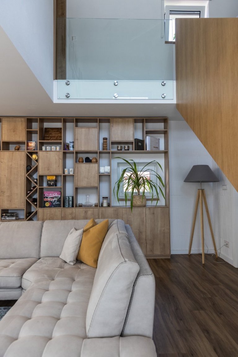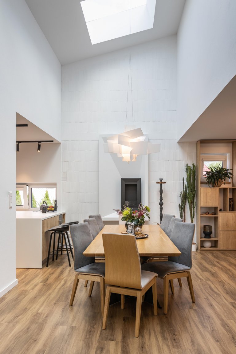 rodinný dom v obci jasenica sa u nás rodil už od samotnej štúdie. pri návrhu interiéru sme ku spokojnosti klientov zapracovali najmä požiadavku aby interiér pôsobil útulne, boli použité zemité farby, drevo. interiér sa mal uberať do súčasného,škandinávskeho štýlu s jemnými prvkami vidieckeho. tehlové tvarovky namaľované na bielo a priznaný pohľadový betón poskytli priestor na niečo nezvyčajné a originálne