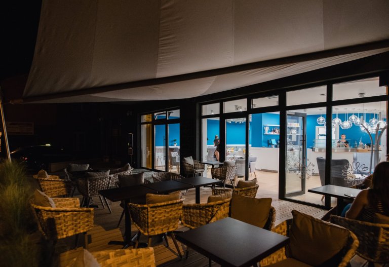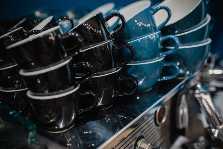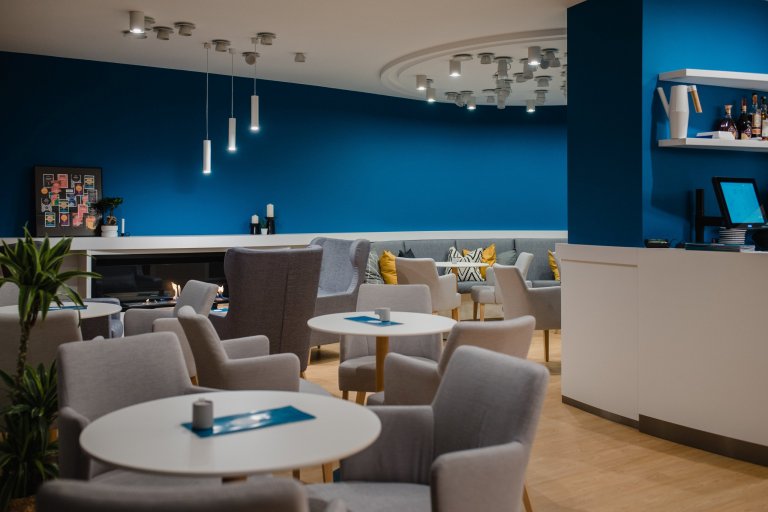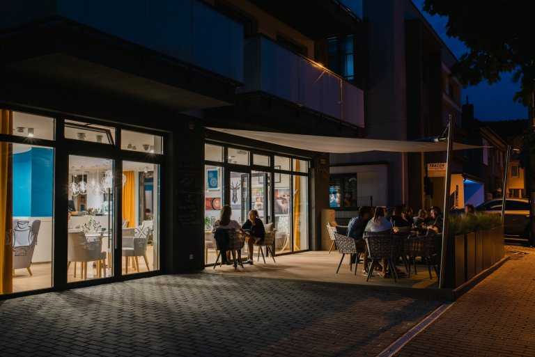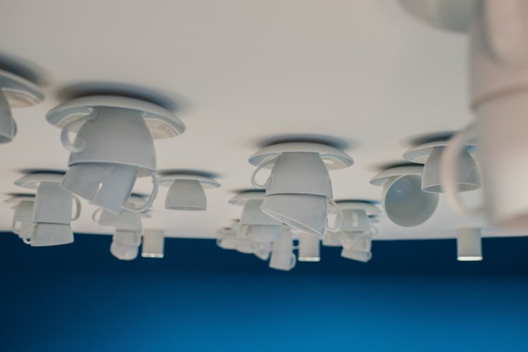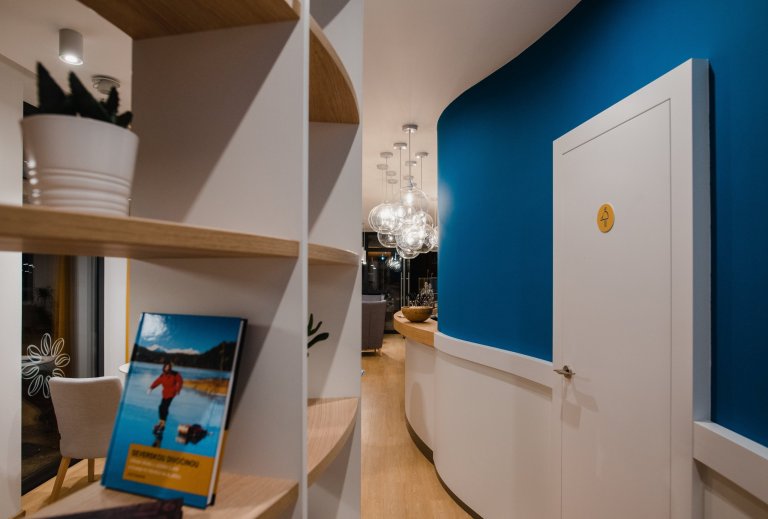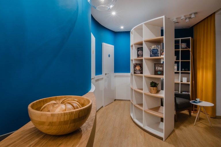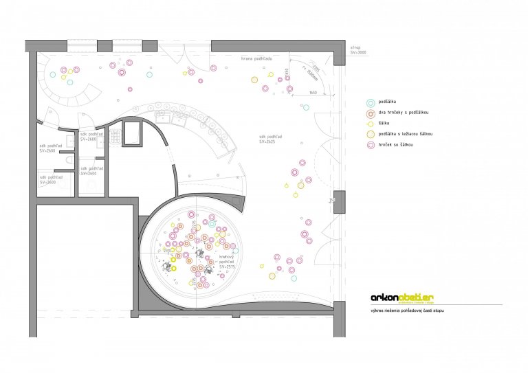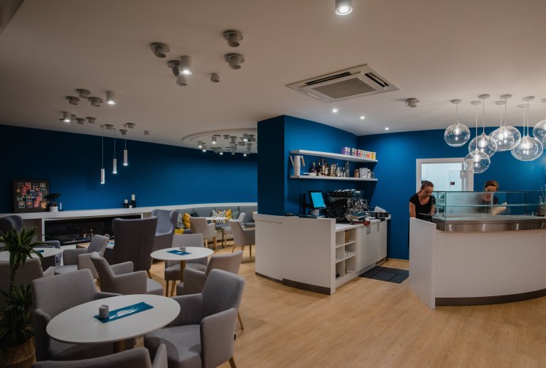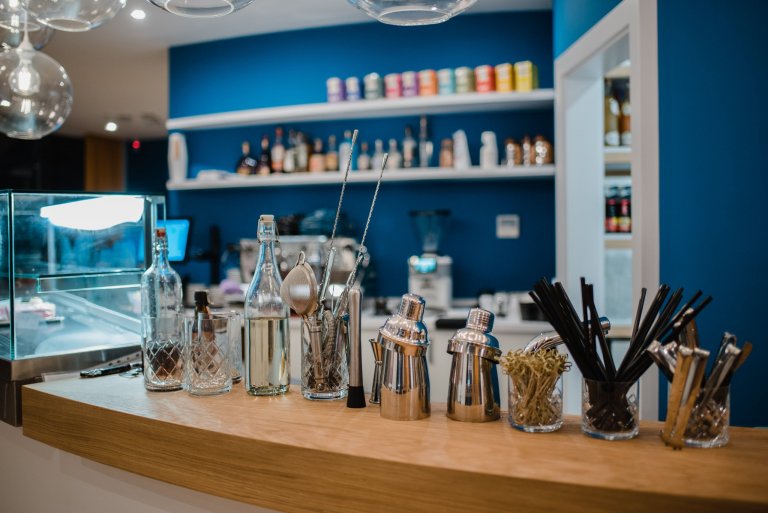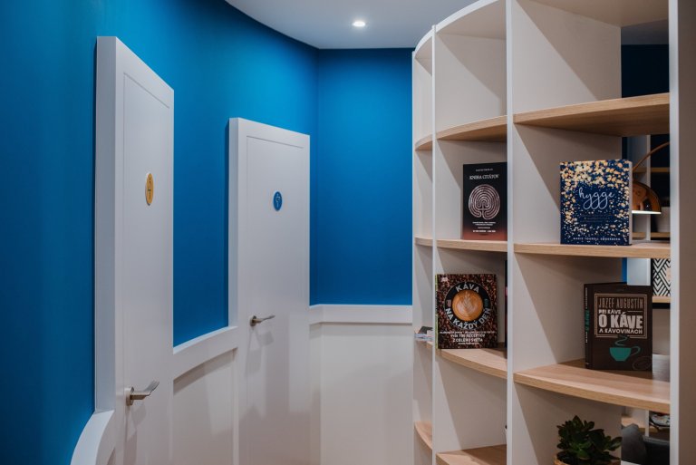 Cieľom bolo vytvoriť jedinečný a originálny interiér kaviarne v škandinávskom štýle podľa požiadaviek investorov s použitím modrej petrolejovej farby, dominujúcej v priestore. V novostavbe sme sa museli vyrovnať s konštrukciou stĺpa v strede dispozície, ktorý do nej výrazne vstupoval. Nadväzujúcimi prvkami sme priestor rozčlenili do viacerých zón s osobitým charakterom, ako napríklad intímny priestor s lavicovým sedením v kruhovom zálive, pohodlné sedenie pri bio krbe, ako aj stoličkové sedenie pozdĺž výkladového presklenia. Paraván prekrývajúci vstupy do WC vytvoril čítací kút, v predstavách investora slúžiaci ako jeho osobné miesto. Centrálnym dominantným prvkom kaviarne je barový pult so zakrivenou vitrínou na zákusky, ktoré sa ponúkajú zákazníkom ´´ako na dlani´´. Ozvláštnením priestoru a prvkom, odlišujúcim kaviareň od iných v meste, je atypický strop. Jeho výška nám neumožnila pracovať s jeho plasticitou a zároveň konštrukcie prekladov vytvárali rušivý element priestoru. Prekrytím týchto prvkov, sa získal priestor na osadenie rozvodov klimatizácie a audiosystému. Plasticitu sme dotvorili originálnou kolážou kaviarenského porcelánu, s použitím kombinácie kotvení skrutkami a špeciálnymi lepidlami. Samotné stvárnenie stropu v zákazníkoch neustále vytvára nadšenie a úsmevnú otázku : ´´Ako to tam drží ?´´ Celý priestor je zariadený v šedých tónoch a jemných odtieňoch dreva, aby bolo jednoduché meniť jeho náladu napr. výmenou závesov a farebných doplnkov. Podlaha je vinylová a zariadenie je kombináciou mobiliáru a nábytku na mieru. Celý koncept sme dotvorili v spolupráci s dizajnérkou Johannou Bilak, žijúcou v Holandsku, ktorá pre kaviareň navrhla logo. Kaviareň dopĺňa terasa, ktorá je vstupným prvkom do kaviarne. Je zvýšená o úroveň jedného stupňa voči chodníku, čím nevytvára bariéru ale je opticky odčlenená od okolia. Ochrana proti slnku a dažďu je tvorená tieniacim rolom, ktorého subtílna konštrukcia sa najlepšie hodila k celému návrhu.