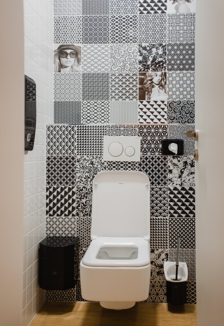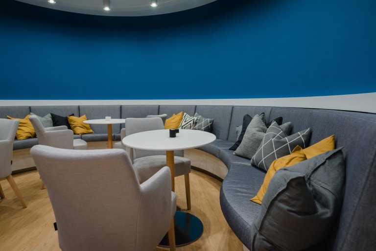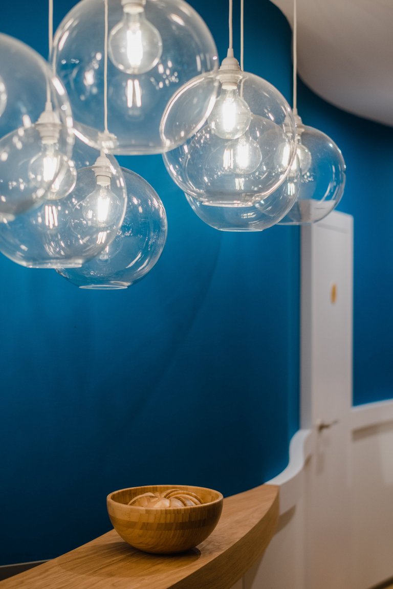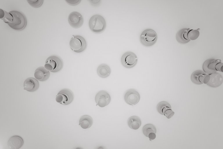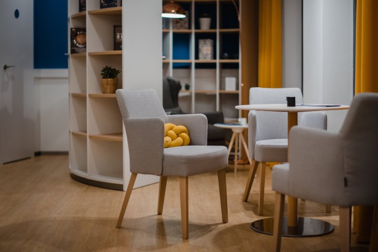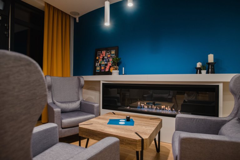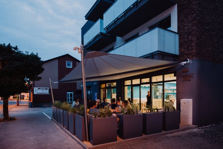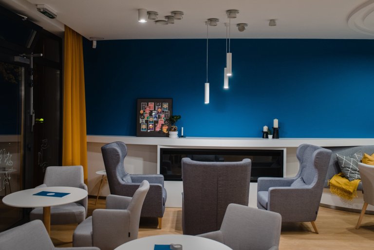Cieľom bolo vytvoriť jedinečný a originálny interiér kaviarne v škandinávskom štýle podľa požiadaviek investorov s použitím modrej petrolejovej farby, dominujúcej v priestore. V novostavbe sme sa museli vyrovnať s konštrukciou stĺpa v strede dispozície, ktorý do nej výrazne vstupoval. Nadväzujúcimi prvkami sme priestor rozčlenili do viacerých zón s osobitým charakterom, ako napríklad intímny priestor s lavicovým sedením v kruhovom zálive, pohodlné sedenie pri bio krbe, ako aj stoličkové sedenie pozdĺž výkladového presklenia. Paraván prekrývajúci vstupy do WC vytvoril čítací kút, v predstavách investora slúžiaci ako jeho osobné miesto. Centrálnym dominantným prvkom kaviarne je barový pult so zakrivenou vitrínou na zákusky, ktoré sa ponúkajú zákazníkom ´´ako na dlani´´. Ozvláštnením priestoru a prvkom, odlišujúcim kaviareň od iných v meste, je atypický strop. Jeho výška nám neumožnila pracovať s jeho plasticitou a zároveň konštrukcie prekladov vytvárali rušivý element priestoru. Prekrytím týchto prvkov, sa získal priestor na osadenie rozvodov klimatizácie a audiosystému. Plasticitu sme dotvorili originálnou kolážou kaviarenského porcelánu, s použitím kombinácie kotvení skrutkami a špeciálnymi lepidlami. Samotné stvárnenie stropu v zákazníkoch neustále vytvára nadšenie a úsmevnú otázku : ´´Ako to tam drží ?´´ Celý priestor je zariadený v šedých tónoch a jemných odtieňoch dreva, aby bolo jednoduché meniť jeho náladu napr. výmenou závesov a farebných doplnkov. Podlaha je vinylová a zariadenie je kombináciou mobiliáru a nábytku na mieru. Celý koncept sme dotvorili v spolupráci s dizajnérkou Johannou Bilak, žijúcou v Holandsku, ktorá pre kaviareň navrhla logo. Kaviareň dopĺňa terasa, ktorá je vstupným prvkom do kaviarne. Je zvýšená o úroveň jedného stupňa voči chodníku, čím nevytvára bariéru ale je opticky odčlenená od okolia. Ochrana proti slnku a dažďu je tvorená tieniacim rolom, ktorého subtílna konštrukcia sa najlepšie hodila k celému návrhu.