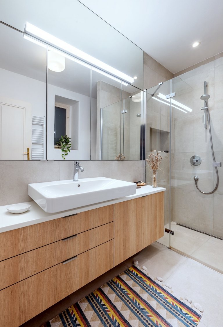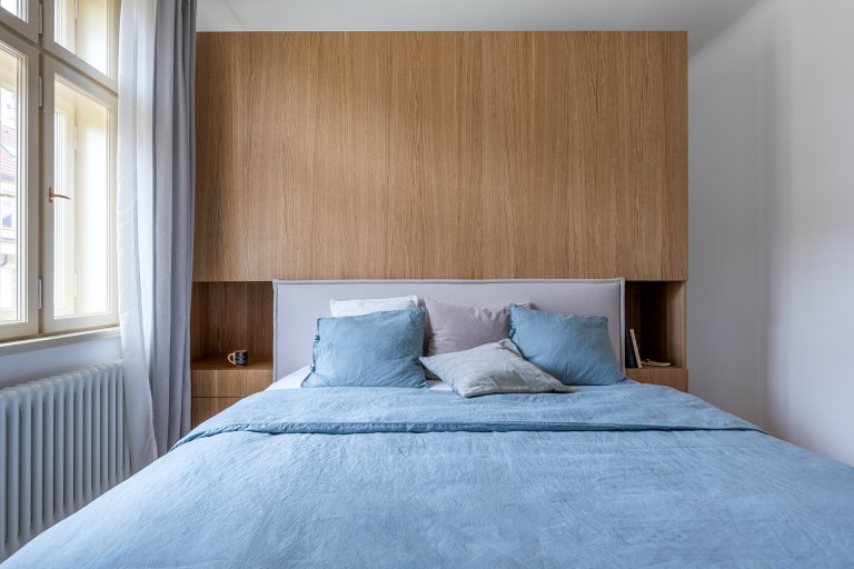 Zhostili jsme se rekonstrukce nárožního bytu v rohovém historickém činžovním domě v pražských Holešovicích. Výchozím stavem byl vybydlený byt s nešťastnou dispozicí s průchozími a špatně využitelnými pokoji. Mimo několika původních dveří s původním kováním nebylo co zachovávat. Přáním nového majitele bylo současné městské bydlení pro pár a prostor pro práci z domova. Po vybourání na výjimku všech nenosných příček vznikl polygonální prostor obvodových stěn s mnoha různými úhly. Novou dispozici jsme vyladili na 3+kk, kde hlavní obytný prostor s kuchyní je umístěn v nejhezčím prostoru v nároží domu, přístupný novou, nepravidelnou chodbou.