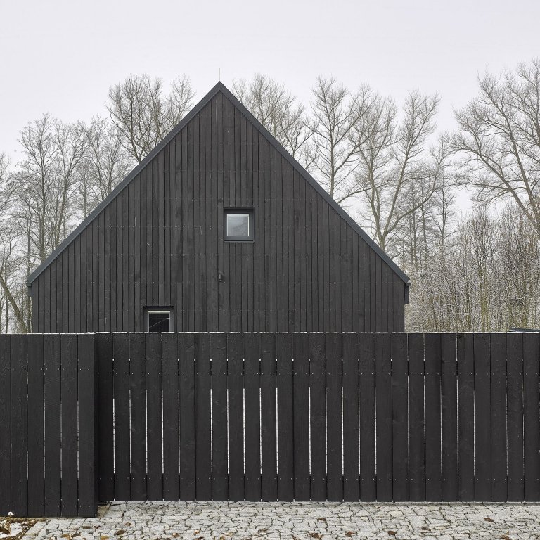 Lehce svažitý pozemek se nachází v přímé blízkosti vodní nádrže Lipno. Umístění stavby na parcele je zvoleno tak, aby hlavní obytný prostor nabízel výhled na vodní hladinu. Dům svou hmotou odkazuje na typologii původních šumavských chalup. Černá fasáda z opalovaného modřínu kontrastuje se světlým interiérem kompletně vyrobeným ze smrkové biodesky. Dřevostavba je založena na kamenné platformě, která objekt ze třech stran lemuje a vytváří krytou i nekrytou terasu. Dispozice přízemí stavby je navržena jako otevřený vzdušný prostor propojený s exteriérem, který je ve své hlavní části převýšený až k hřebeni střechy. V podkroví se nachází dvě ložnice a galerie. Pro pocit bezpečí a soukromí jsou v přízemí navržené pohyblivé posuvné dřevěné okenice. Přírodě blízké zahradě dominuje vzrostlý dub bahenní.
