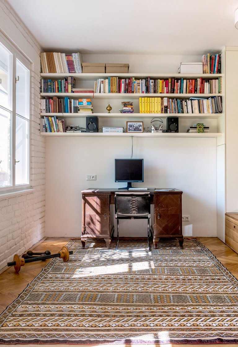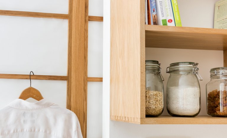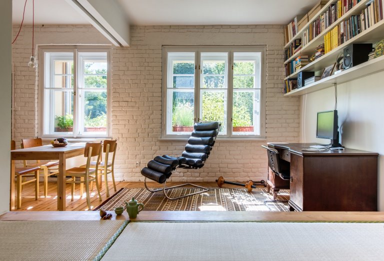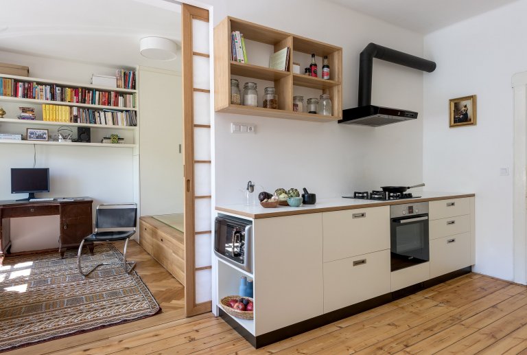 Rekonstrukce prostorově úsporného bytu, v němž chybí místo na samostatný obývací pokoj, byla velkou výzvou. Zadáním bylo mimo jíné propojit původní nábytek s asijskými prvky, multifunkční využití pódia s tatami znamenalo pro tak malý byt velké plus. Díky odstranění příčky mezi pokoji došlo k vytvoření jednoho vzdušného prostoru, který lze rozdělit japonskou posuvnou stěnou. Tím jsme vpustili do celého prostoru více světla a vzduchu a mohli jsme majiteli splnit přání velké pohodlné kuchyně s jídelním stolem.