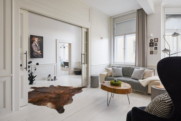Hlavní linkou celého konceptu je kombinace původních prvků a současného designu. I přesto, že se v bytě původních prvků moc nedochovalo, rozhodli jsme se většinu stavebních prvků obnovit a doplnit. Celý interiér je laděn do bílé včetně masivní prkenné podlahy. Kontrastní plochou je výrazná malba stěny v obývacím pokoji a vstupní hale. Původním záměrem byla oškrábaná omítka, které nebylo možné kvůli novým rozvodů elektro dosáhnout. Nicméně myšlenku „plesnivé zdi“ jsme se rozhodli neopustit a po několika desítkách vzorků padla volba na malbu kulis. Materiály jednotlivých solitérů jsou voleny opět do kontrastu s bílým základem. Stěny jsou doplněny kazetovým obložením, které pod okny kryje radiátory. Stropy jsou doplněny profilovanými rohovými lištami.