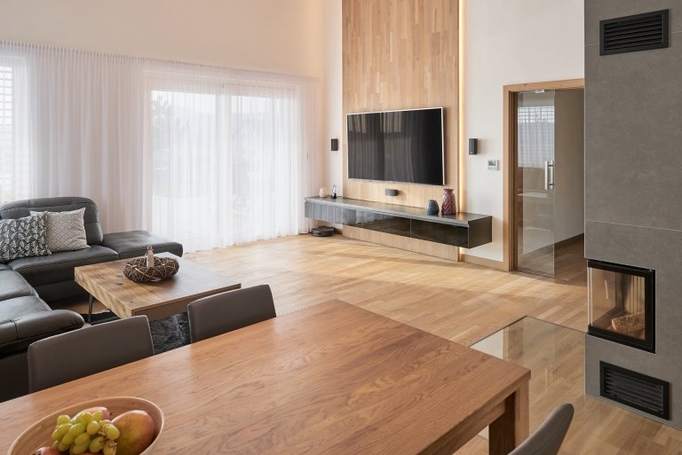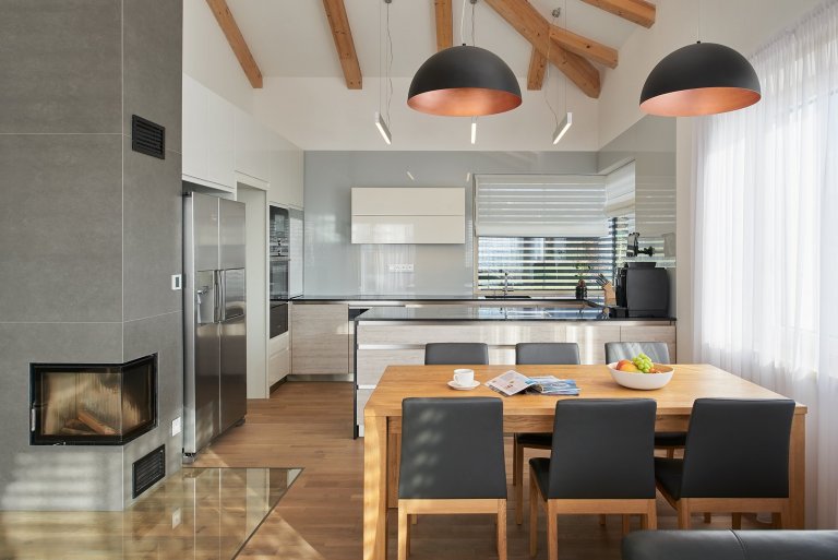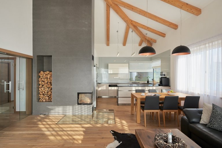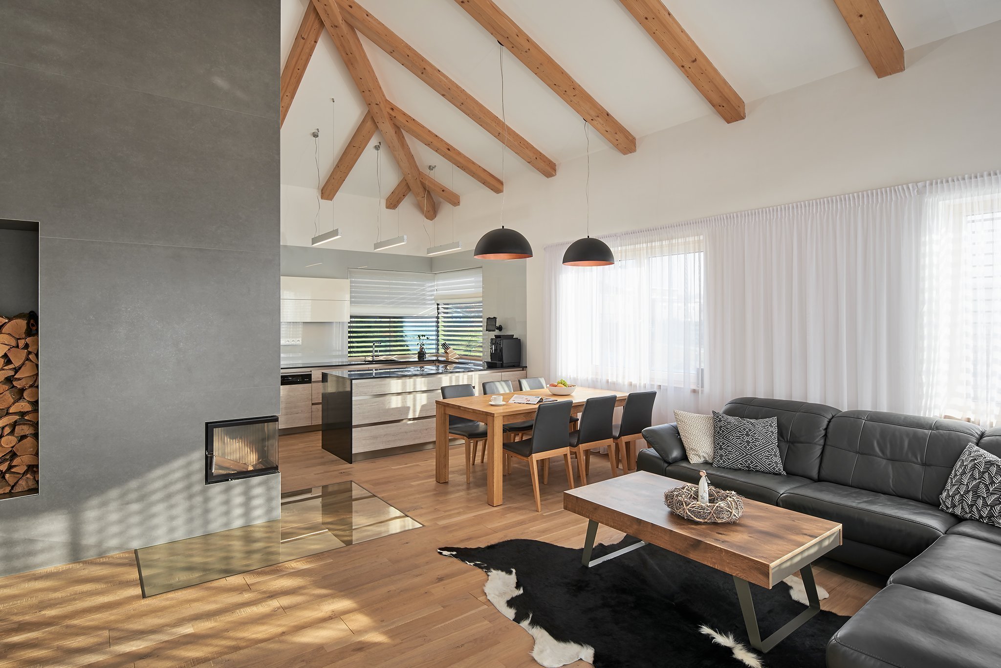 Moderní interiér domu v obývací části s vysokým stropem kde konstrukce krovu ze smrkových trámů zůstala částečně viditelná. Interiér dýchá příjemnou atmosférou
