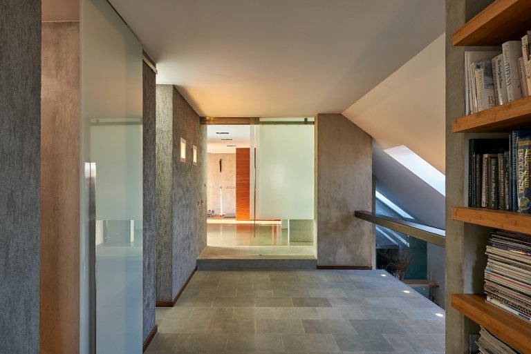 Dřevěné schodiště na železných traverzách zve do galerie druhého patra, kde začíná soukromá část bytu sestávající z hlavní ložnice (s vestavěnými skříněmi) a pracovny. Další místnosti přímo vybízí k regeneraci - řeč je o menším fitness, finské sauně a en-suite koupelně. Dispozici bytu uzavírá střešní terasa.