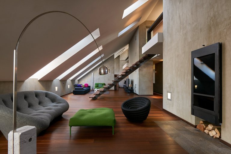 Velkorysý otevřený prostor, kvalitní materiály a nadčasovost, to jsou hlavní charakteristiky moderního mezonetu se střešní terasou z dílny architektky a designérky Barbory Škorpilové, situovaného v 6. a 7.NP rohového domu v blízkosti Mahlerových Sadů na Praze 3.