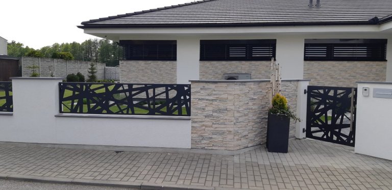 Realizované oplocení nového rodinného domu. Výška plotových dílců koresponduje se šířkou oken domu v pozadí. Moderní design však strhává pozornost více na hliníkový plot. Jeho vzdušnost a průhlednost jistě není na škodu. Ochrana soukromí nebo jeho neprůhlednost nebyla v tomto případě požadavkem. Silné kontrasty barev černé a bílé, síla sloupků a nosných sloupů domu koresponduje jak na domě, tak na plotě. Velká vjezdová brána s posuvem nebyla problémem vzhledem k její ploše, terénu nebo prostoru pro výjezd. A na řešení bylo dostatek prostoru i za zděnou částí plotu. Již při stavbě s tím bylo počítáno. Exteriér byl u vchodové branky ještě doplněn ocelovým květináčem ve stejné barvě.