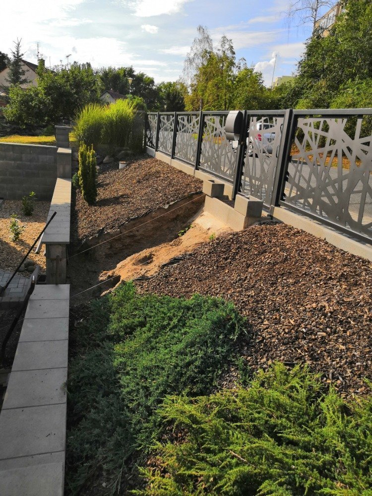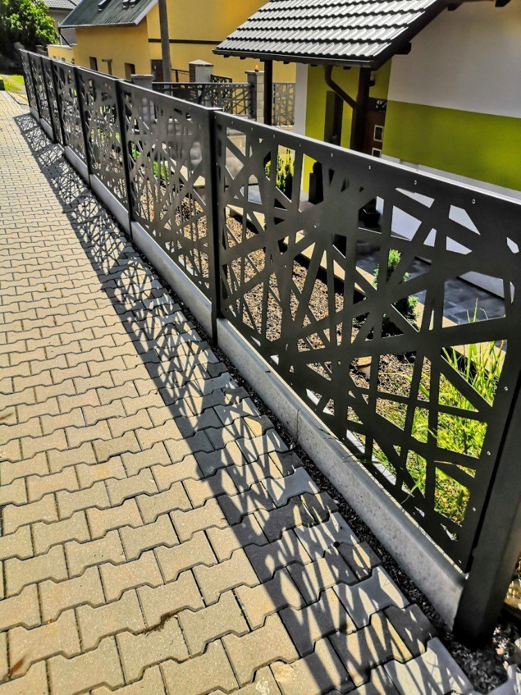 Jednou z dalších realizací bylo oplocení rodinného domku v Čáslavi. Jeho poloha není bohužel dost ideální. Je zapuštěný pod úrovní ulice. Řešili jsme tedy společně s majitelem, jak provést úpravu krátkého svažitého terénu se zídkou předzahrádky. Zároveň pak stavbu základů pro plot, spodní podezdění a jeho výšku. To má samozřejmě také praktický význam. Ze strany chodníku je v pdzimních a zimních měsících ochrannou proti nečistotám, vodě a sněhu. Výška pro hliníkový plot menohla být moc velká, aby zcela nazsínila dům. Volili jsme také vzdušnější a řidší vzor pavučiny, aby nedošlo zcela k zastínění. Tento vzor designového plotu je mezi zákazníky velice populární a má i velice pozitivní recenze. V černé barvě je hliníkový plot nejen praktický, ale i kontrastem k syté barvě fasády domu.