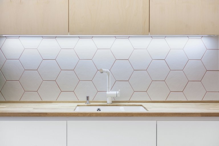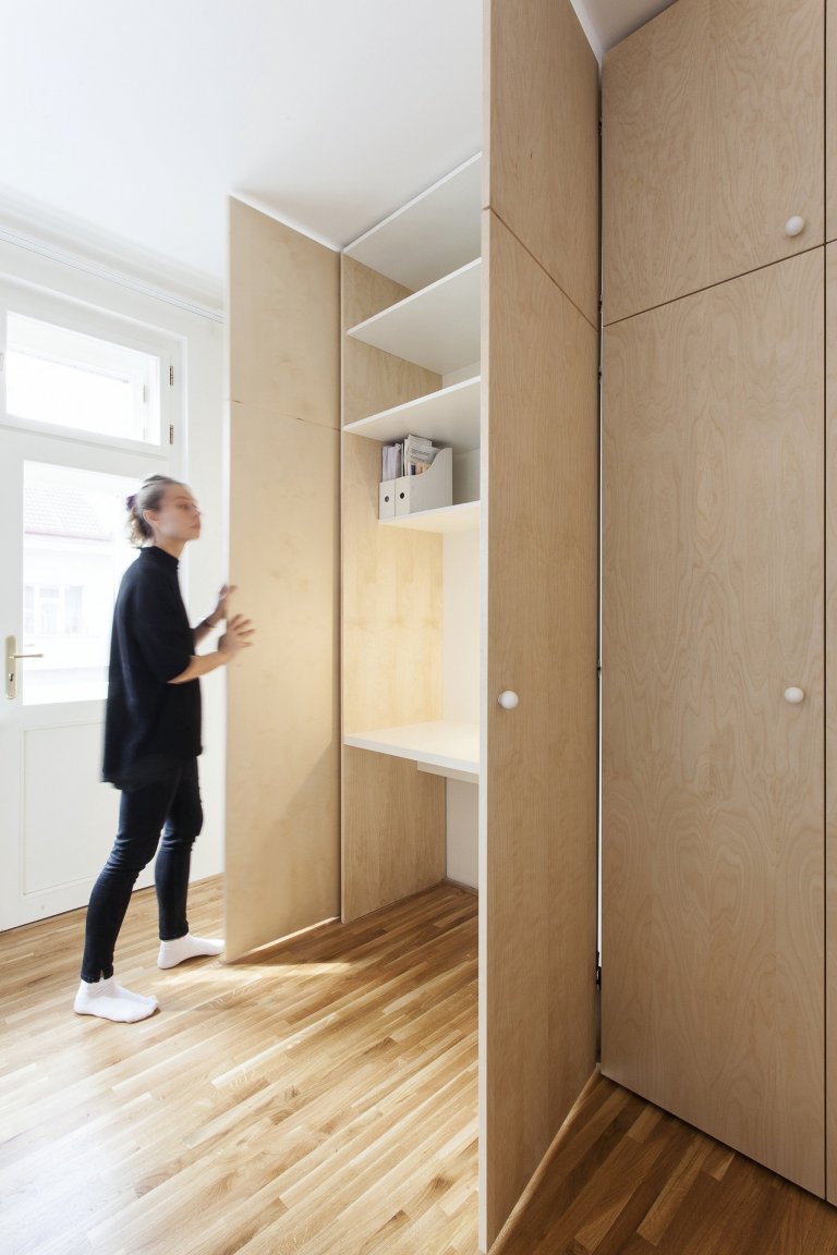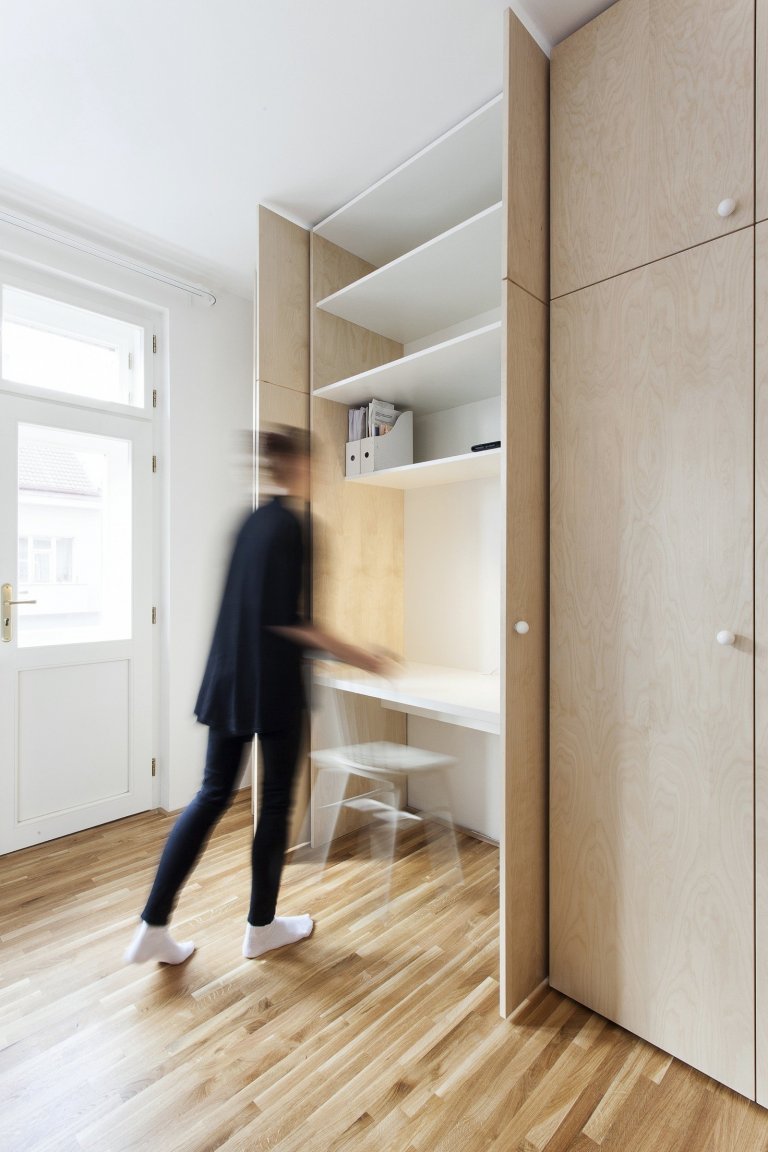 Hned po příchodu do bytu se skrz hlavní obytný prostor otevírá průhled až do ulice. Do velké vstupní haly bez přímého denního osvětlení vestavujeme uzavíratelnou pracovnu, přisvětlenou přes schodiště luxferovým oknem, situovaným v místě zrušených vstupních dveří do jedné ze dvou původních bytových jednotek. Neobvyklým prvkem v hlavním obytném prostoru se stává vestavěná válenda v nice, využívající vystupující prostor stávajícího členění fasády. Součástí bytu je také ložnice se samostatnou koupelnou a v jeho protilehlé části dva dětské pokoje s oddělenými šatnami. Celý interiér ladíme do světlých přírodních tónů, původní parketovou podlahu ponecháváme, stejně jako špaletová okna a vnitřní dveře.