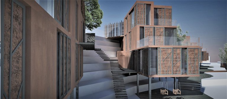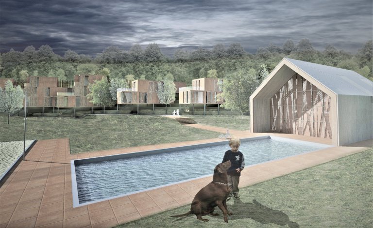 Studie skupiny rodinných domů zasazených do terénu. Obložené cortenovým plechem a dřevěným roštem.
