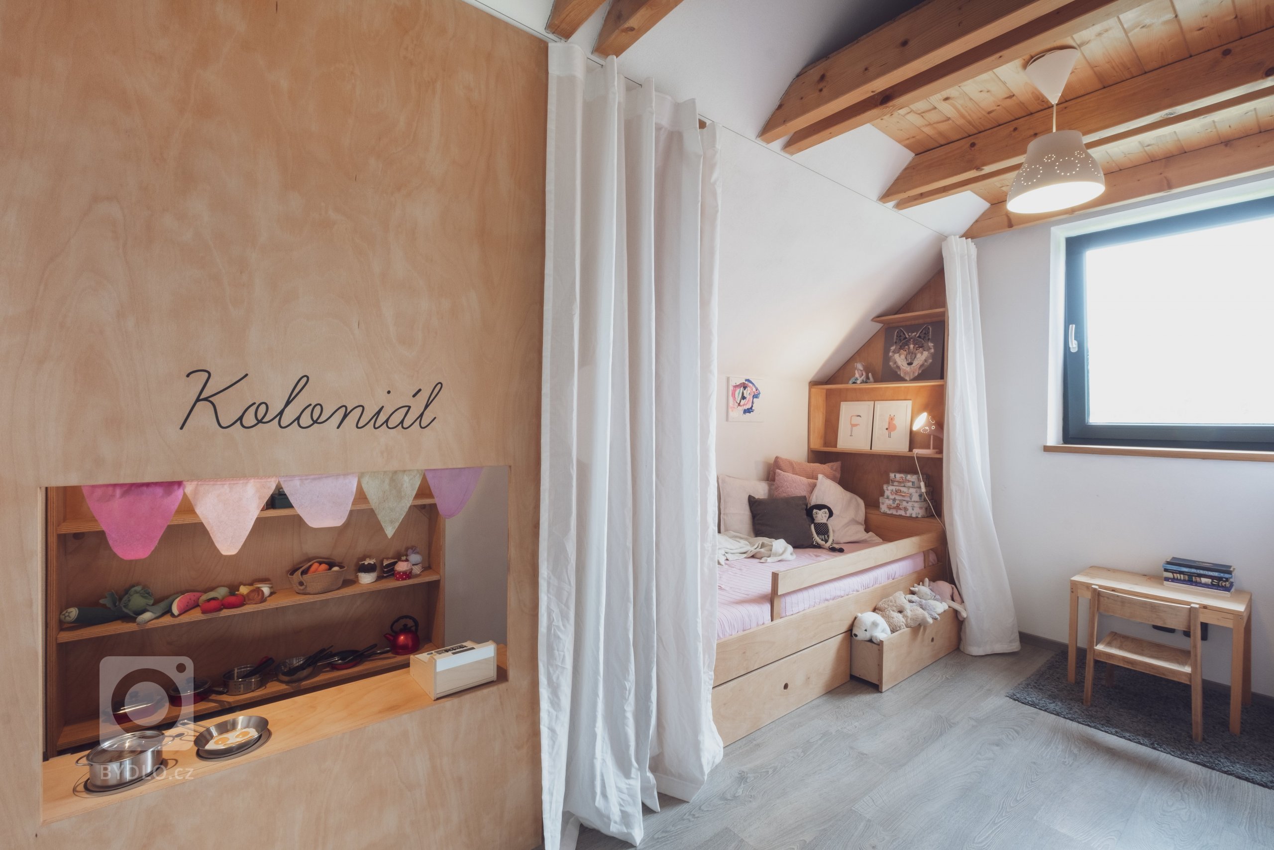 Dětský pokoj k prvním narozeninám malé Belly v podkroví novostavby rodinného domu je prostorově skromný. Úzká dispozice a zkosená šikmina střechy předurčila tvar překližkového boxu, který schovává v jedné části postel s úložným výsuvem a knihovničkou, a v druhé části hrací…