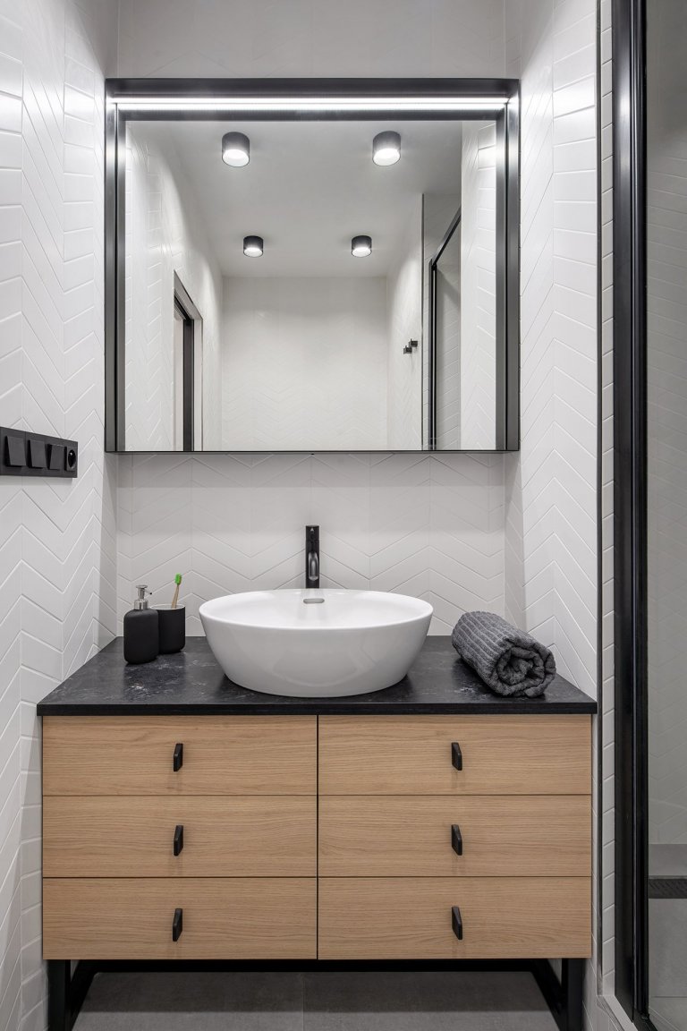 Jedná se o kompletní rekonstrukci malého panelového bytu, původně s dispozicí 1+1 s malou průchozí koupelnou. Jelikož byly veškeré vnitřní konstrukce tvořeny umartem, nebyl problém je vybourat a dispozici otevřít. Nové příčky byly tvořeny sádrokartonem. Z původní dispozice 1+1 byla vytvořena dispozice 2kk, kde ložnice je sice malá, ale je oddělená od zbytku bytu. Dveře byly minimalizovány. Jsou umístěny jedny posuvné dveře do koupelny a jedny dveře se skrytou zárubní do ložnice. Ložnice je uprostřed dispozice a je prosvětlena oknem pod stropem přes kuchyni. Materiálově je byt řešen v odstinech šedé a dřeva s černými detaily. Prvek "stromečku" na podlaze se pak objevuje i na obkladech v koupelně.