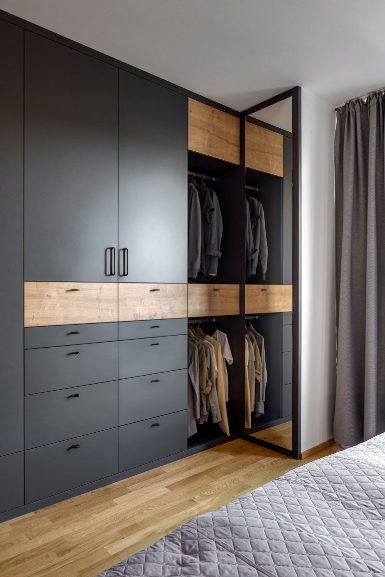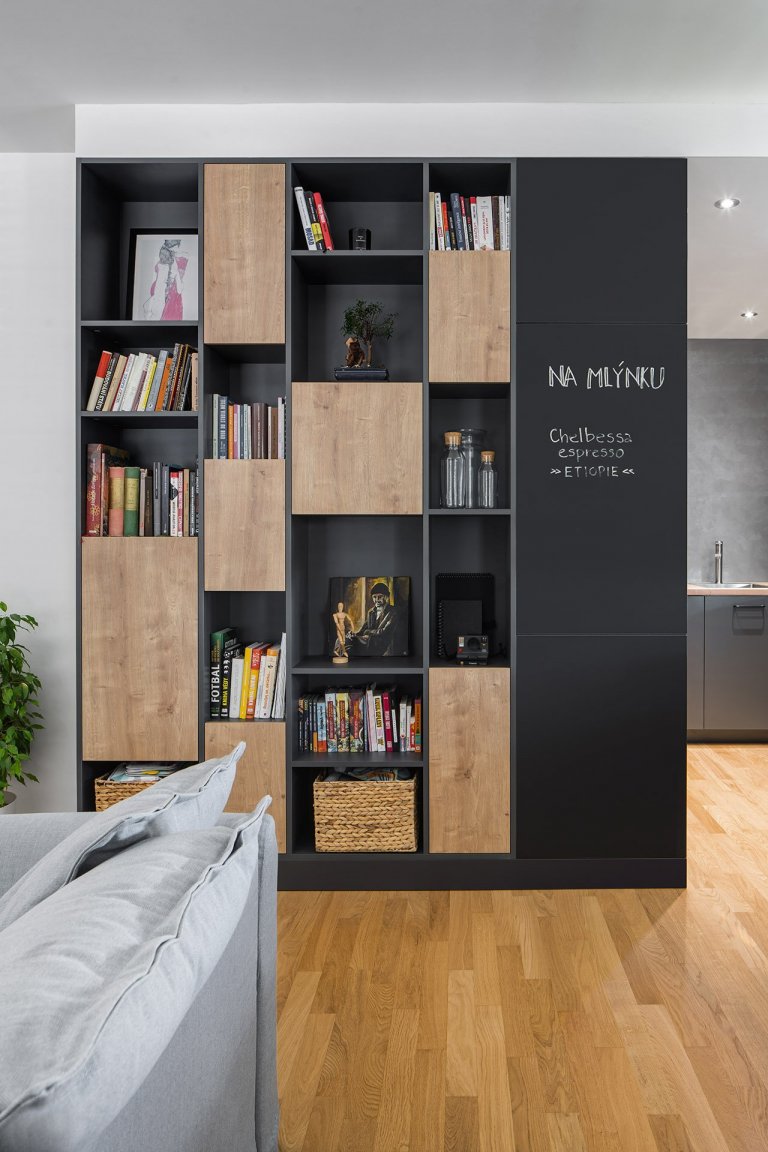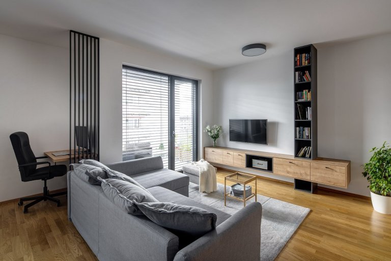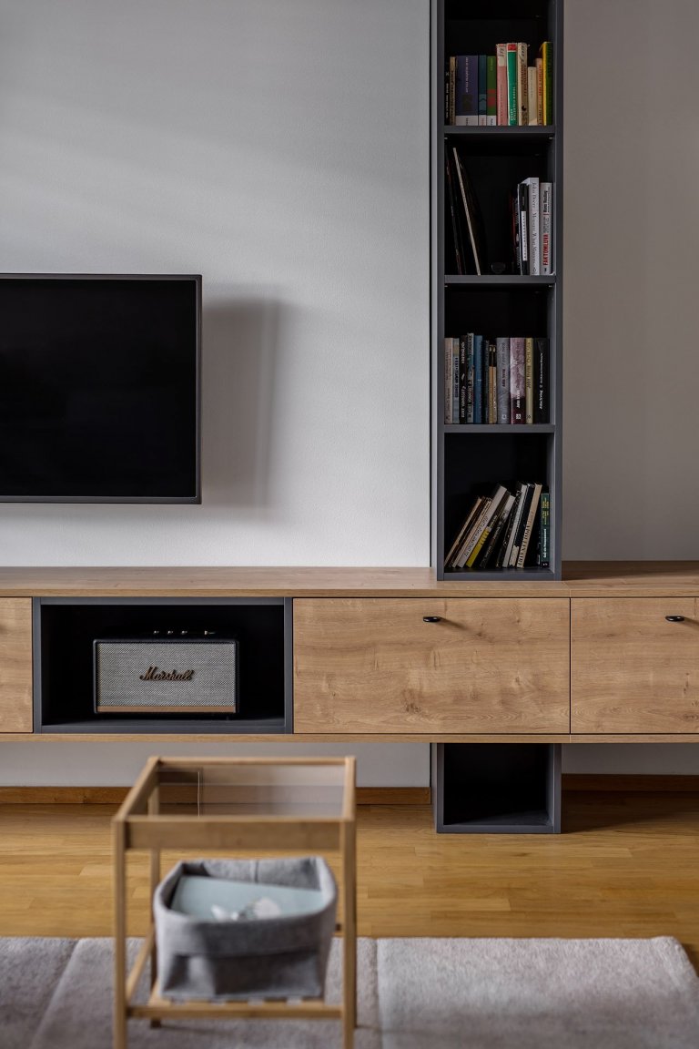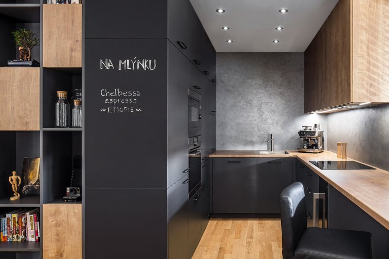 Jednalo se o vybavení interiéru v již hotovém bytě v developerském projektu. Interiér je navržen v kombinaci antracitové barvy a dřevodekoru.