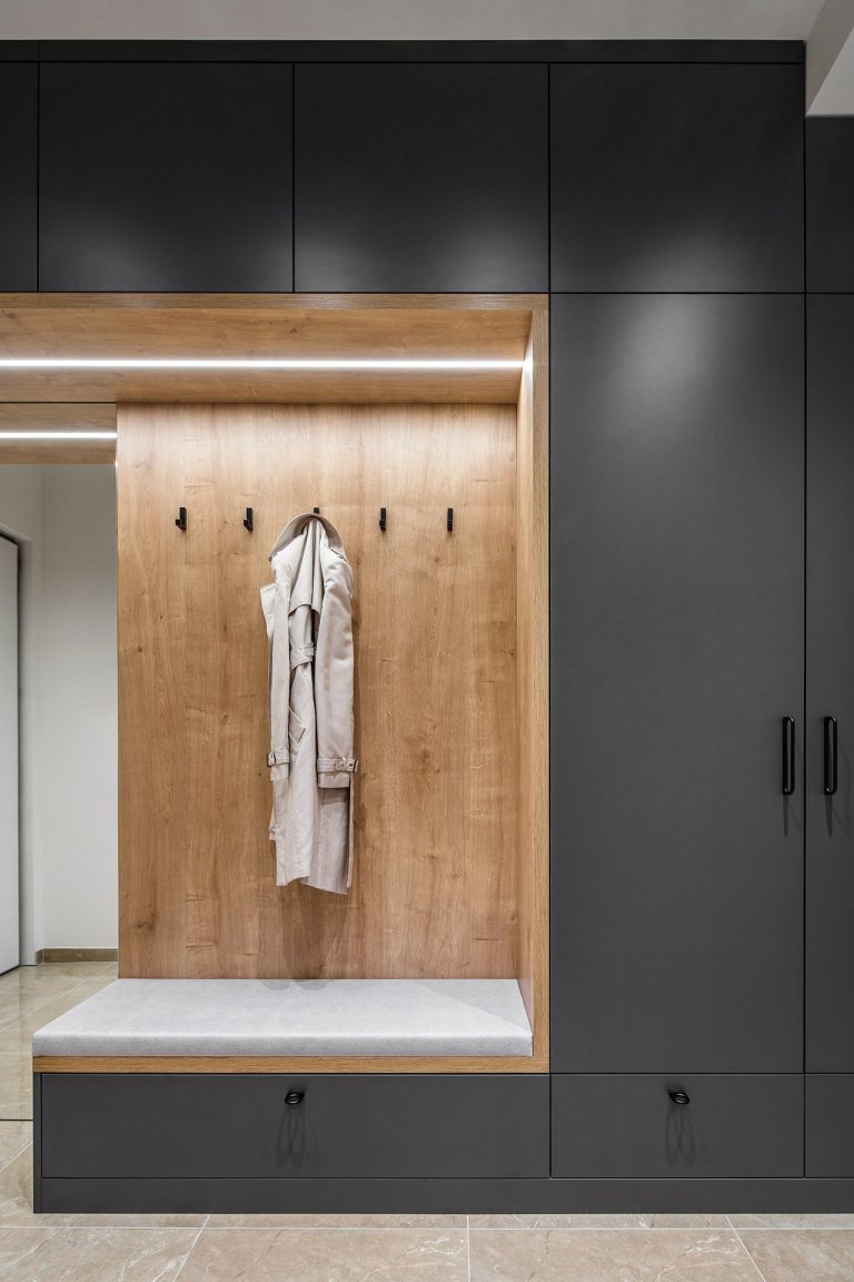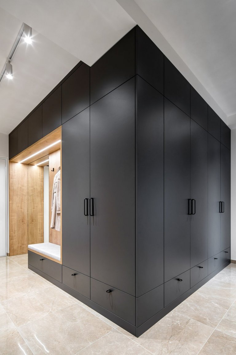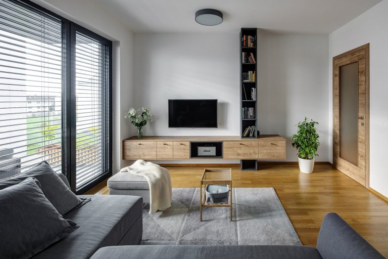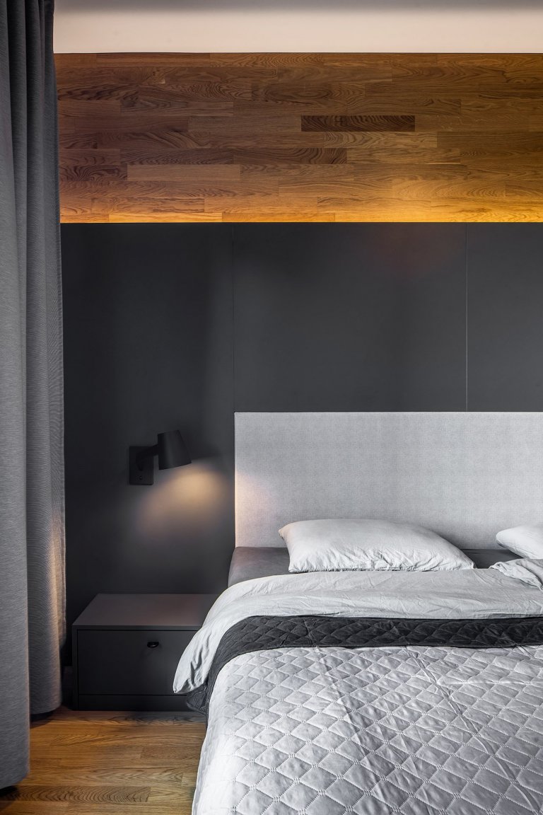 Jednalo se o vybavení interiéru v již hotovém bytě v developerském projektu. Interiér je navržen v kombinaci antracitové barvy a dřevodekoru.