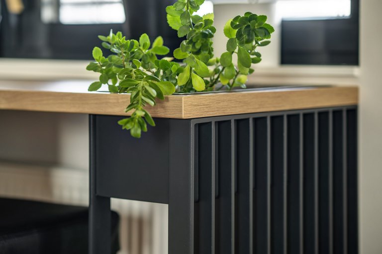 Kuchyňský kout byl zvětšen napojením na knihovnu v obývacím pokoji. Na boční části kuchyně byla vytovřena tabule pro psaní vzkazů. Součástí obývacího pokoje je i pracovní kout, který je oddělen pouze kovovou konstrukcí, která se opakuje i na podnoži barového pultu, navazujícího na kuchyňskou linku.