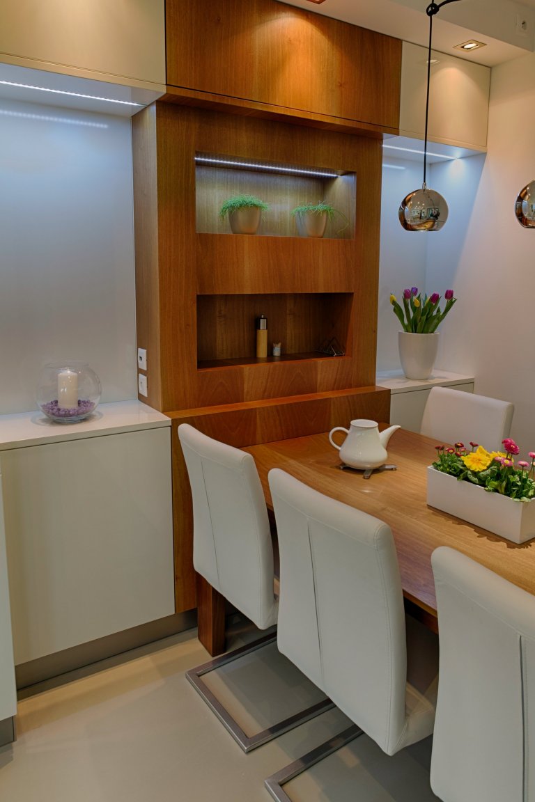 Kuchyně byla navržena v bílém lesku s deskou z umělého kamene. Deska zároveň tvoří parapety oken. Rozkládací stůl, který navazuje na dřevěnou část kuchyně, byl také vytvořen na míru.