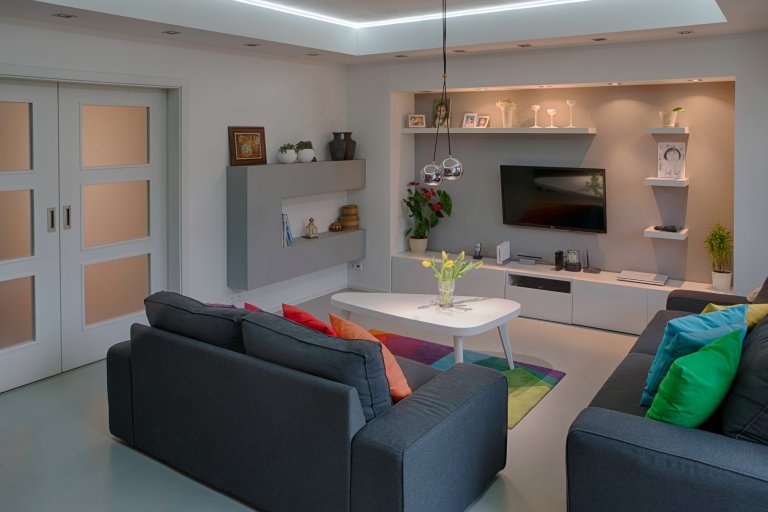 Celý interiér je laděný do odstínů bílé a šedé v kombinaci s ořechovou dýhou, díky níž interiér nepůsobí chladně.
