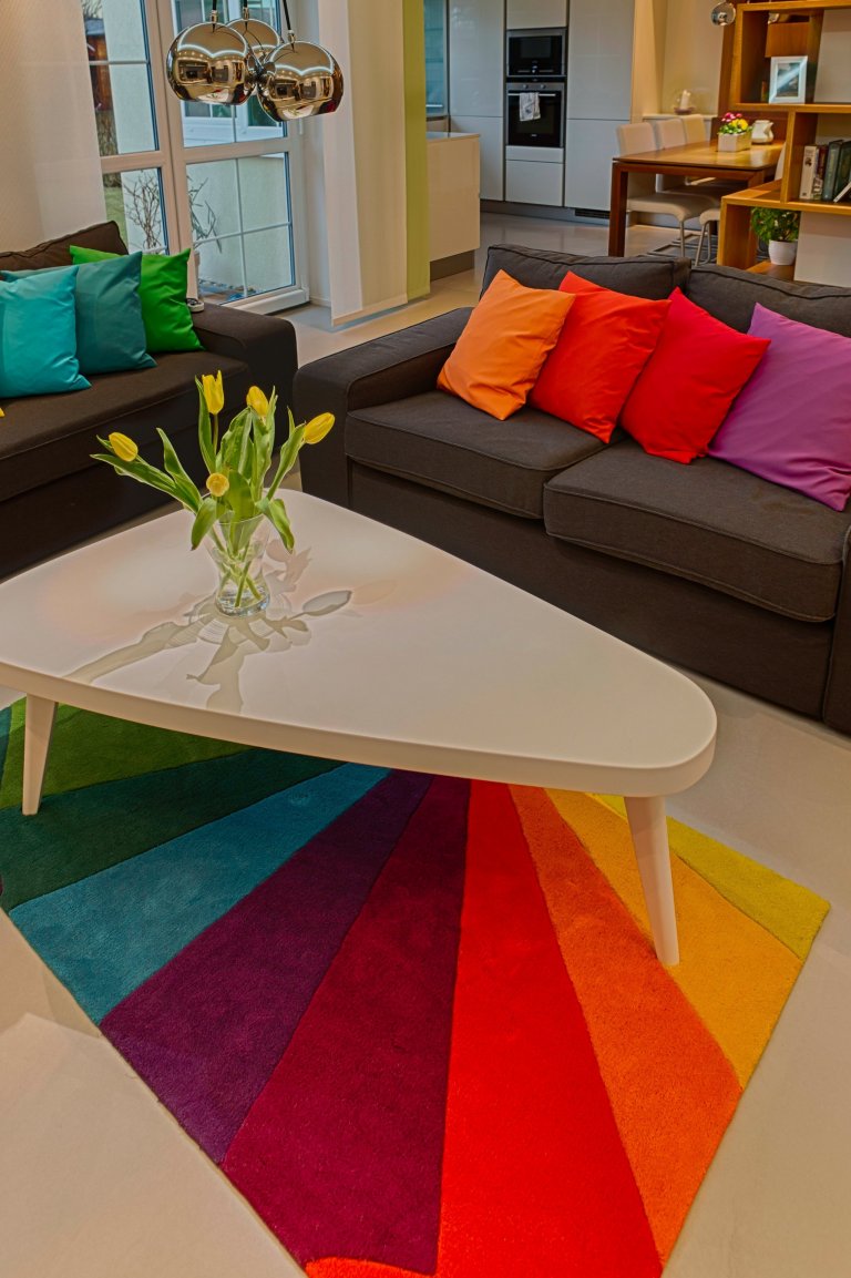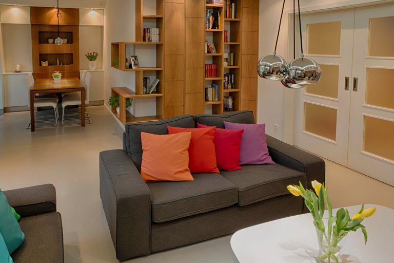V obývacím pokoji je použito minimum nábytku. Nábytek je v bílé barvě, opět v kombinaci s knihovnou z ořechu.
