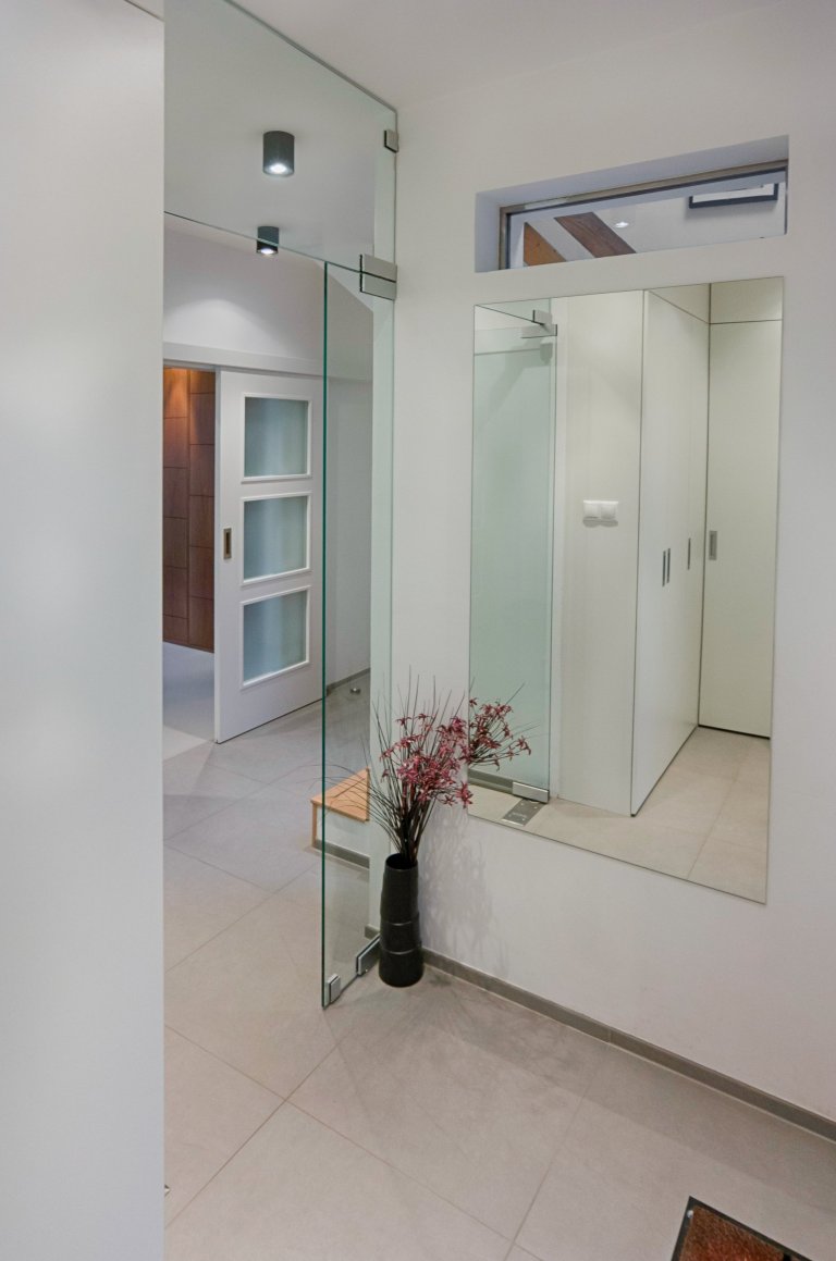U vstupní části došlo k vybourání zdí mezi velmi malou předsíní a komorou (kde byl mimo jiné umístěn i kotel). Dále zdi mezi předsíní a chodbou – tak se otevřela celá vstupní část. Pro nové oddělení předsíně a chodby byly použity celoskleněné dveře, aby zůstala zachována otevřenost a vzdušnost prostoru, ale aby byly prostory zároveň odděleny.