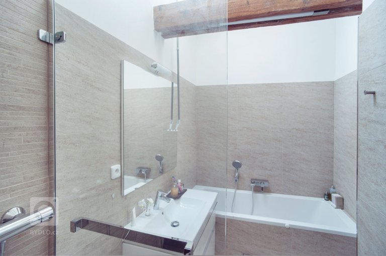 Srdcem zrekonstruovaného půdního prostoru o rozloze 85 m2 v pětipodlažním bytovém domu z konce 19. století v centru Prahy je kuchyně volně propojená s obývacím pokojem, kterému vévodí krb umístěný pod původním komínem. Kuchyňská linka na míru byla navržena svýsuvnou pracovní deskou.