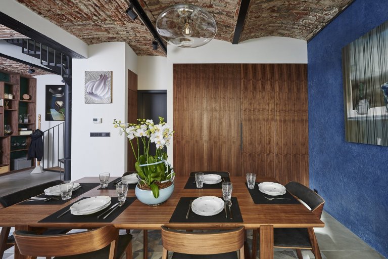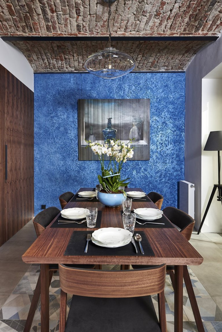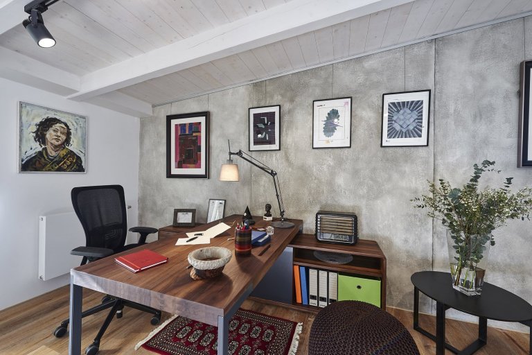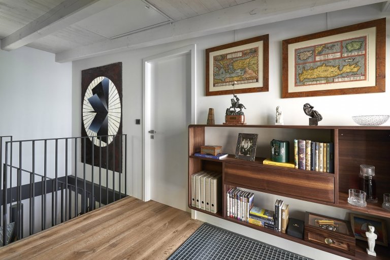 Po předchozí spolupráci jsme byli osloveni klientem AVI, abychom zpracovali návrh ateliéru, kde by klient mohl v příjemném prostředí pracovat, přijímat návštěvy a občas i přenocovat. Interiér měl tedy mít nejen reprezentativní funkci, ale i obytnou se vším vybavením, které k obytné funkci patří. Prostor, který jsme měli k dispozici je dvoupatrový. Přístupný přímo ze dvora objektů staré pražské zástavby. Jelikož se nejednalo o novostavbu, ale konverzi, prostor nabídl krásné cihlové valené klenby do ocelových nosníků, zajímavě pojaté trámoví horního patra a mnoho dalšího, co již definovalo jakým směrem se bude design ubírat. Celková plocha se pohybuje okolo 86m2. Ve spodním patře naleznete spíše reprezentativní část, která se skládá z lounge sezení pro jednání s klienty, velkého jídelního stolu se šesti židlemi a skryté kuchyňky za harmonikovými dveřmi. Dále v tomto patře naleznete koupelnu se sprchou a toaletou. Všechen nábytek, jak vestavný tak volně stojící, je z ořechového dřeva. Většina nábytku pochází od české firmy Ton, sedačka od firmy Polstrin. Knihovna, skříně, koupelnový nábytek a kuchyňská linka jsou atypy námi navržené. Osvětlení, které přikládá důraz k lounge a jídelnímu stolu, je od české firmy Bomma. Horní patro je již spíše soukromé. Naleznete zde pracovnu klienta a ložnici. Návrh a realizace nábytku pracovny jde za firmou Situs. Opět v ořechovém dřevě.