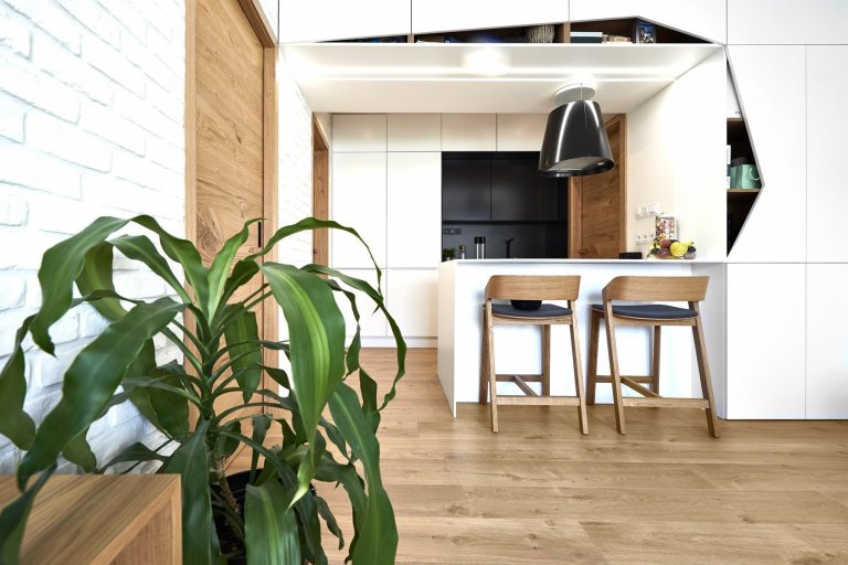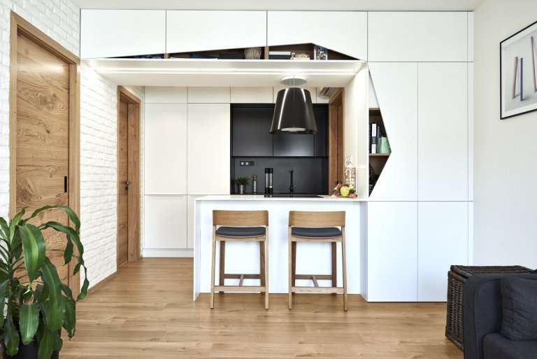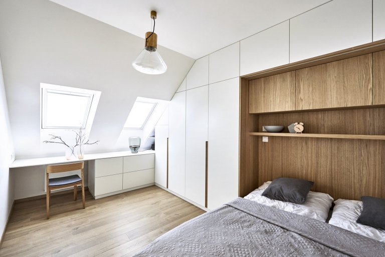 Z původní nevyužité půdy vzniklo úžasné bydlení, co do prostoru to není žádná výhra, ale i přesto má prostor své kouzlo. Byt byl zakoupen ve stavu shell and core. Z původních půdních prostor nově kolaudován na bytovou jednotku o skromné výměře 45m2. Jednalo se tedy o komplexní stavební rekonstrukci, která nám umožnila definovat každý detail bytu. Snažili jsme se co nejvíce zefektivnit malou metráž bytu.
