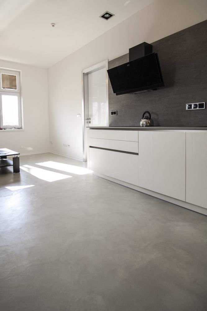 Realizace stěrkované podlahy v dekoru betonu pro rekonstrukci bytu v Praze.