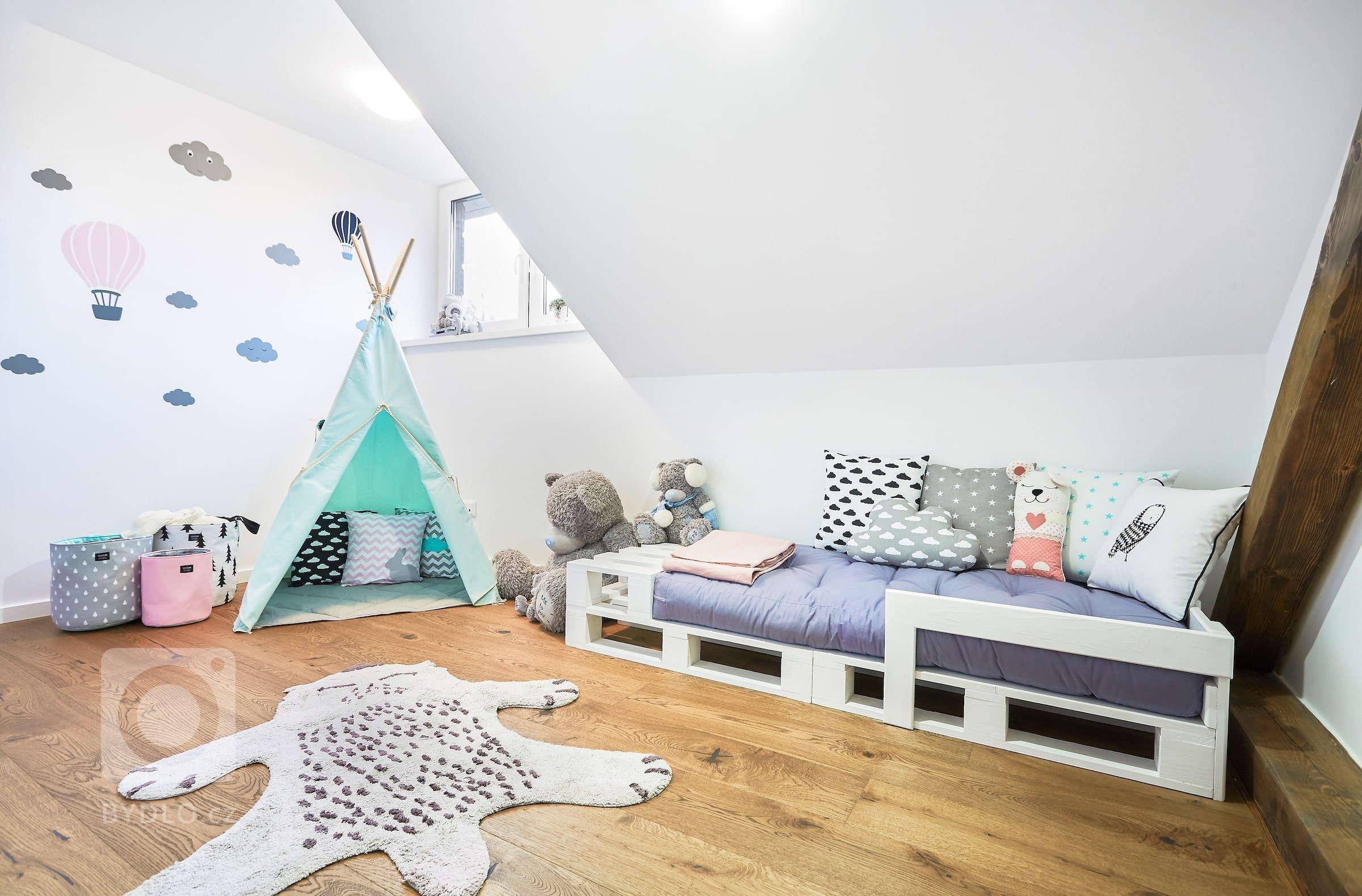Perlou mezi pokoji je ten určený pro malou holčičku. Má dobrodružného ducha i něžnou atmosféru. Kombinace světle šedé, mentolově zelené a pastelově růžové barvy na bílém podkladě působí velmi půvabným dojmem. Přestože se jedná o dětský pokoj, z minimalismu se tu neslevilo. Najdete tu tedy jen nejdůležitější funkční nábytek – paletovou dřevěnou postýlku, šatní skříň a dětskou minilavici, kterou lze vmžiku proměnit na jídelní nebo kreslicí stoleček. Dětské království dotvářejí také dekorace v nice trámové konstrukce a nezbytné plyšové hračky. A protože se jedná o dcerku vášnivých cestovatelů, nemůže tu chybět ani útulné indiánské týpí.