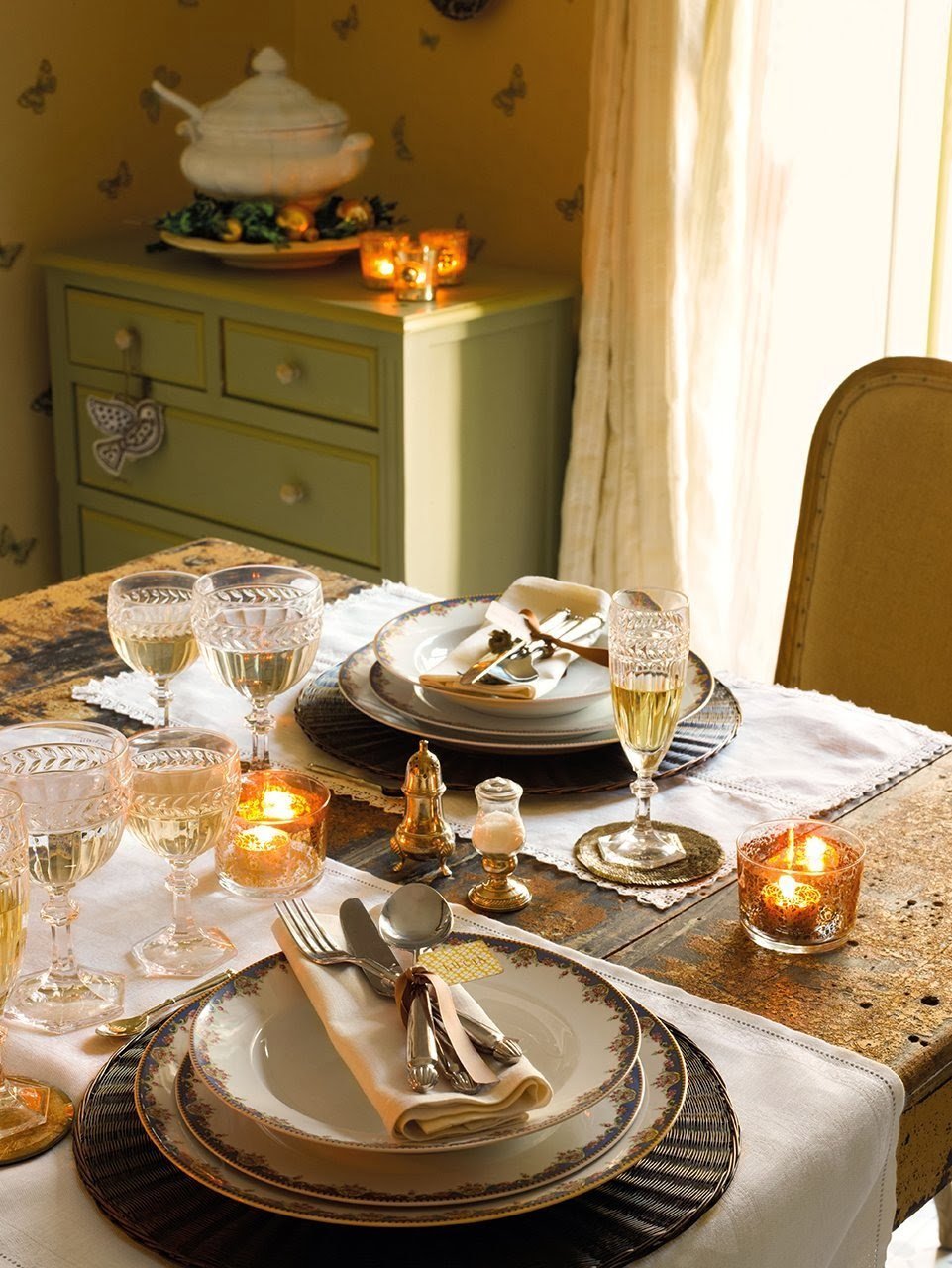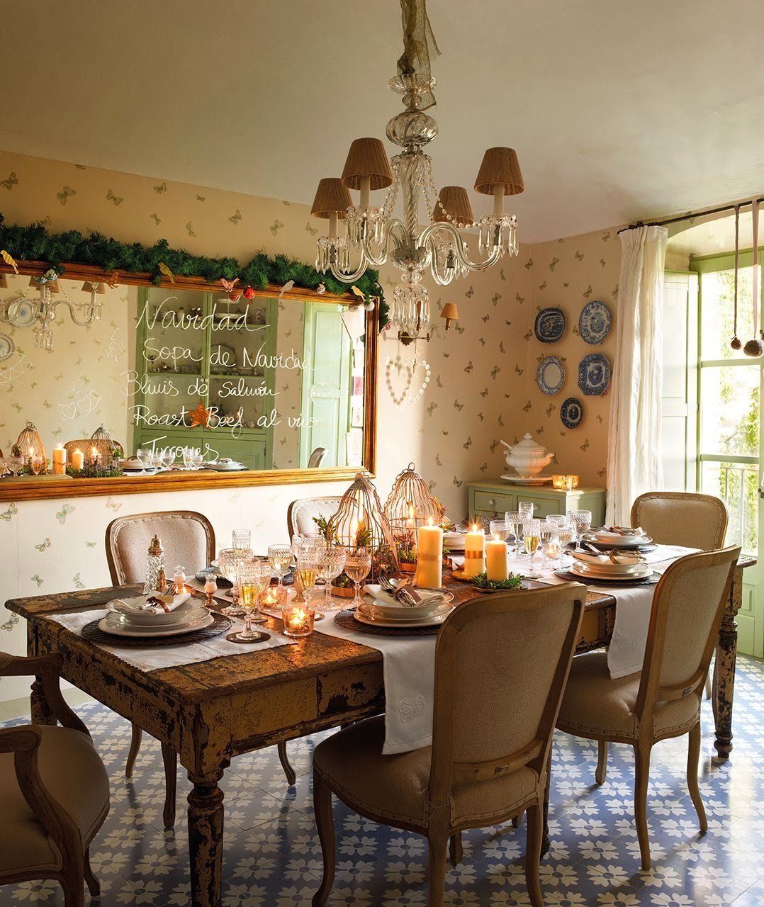 V přízemí se nachází obývací pokoj, kuchyň a jídelna. V obýváku momentálně dominuje vánoční jedlička ozdobena netradičními ozdobami, které prozrazují, že hlavním motivem jejich letošních Vánoc jsou ptáci. Vkusně sladěné vánoční prostírání je jako šité na míru tomuto prostoru. Jídelní stůl s nostalgickou patinou je nejdůležitějším centrem svátečního dění celé rodiny, proto se i jeho výzdobě věnuje patřičná pozornost.