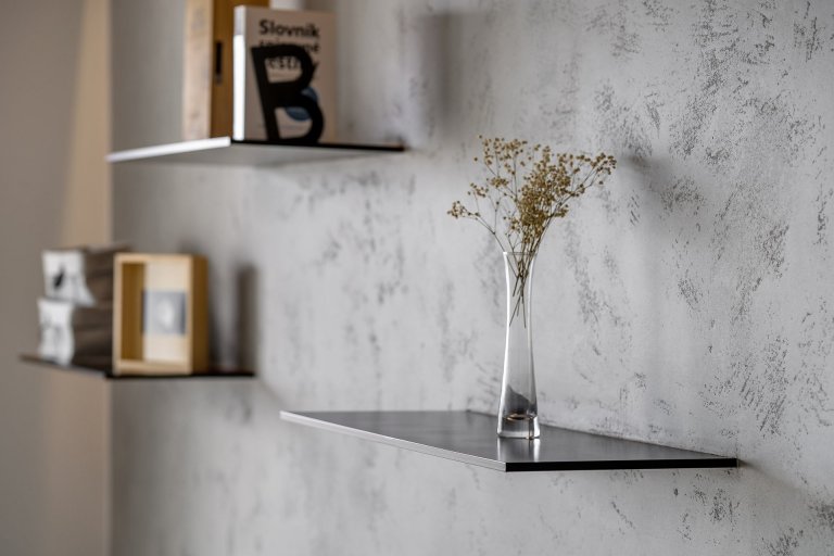 Ocelové police, které jsou jako žiletky vsazeny do stěny, vytváří decentní knihovnu.
