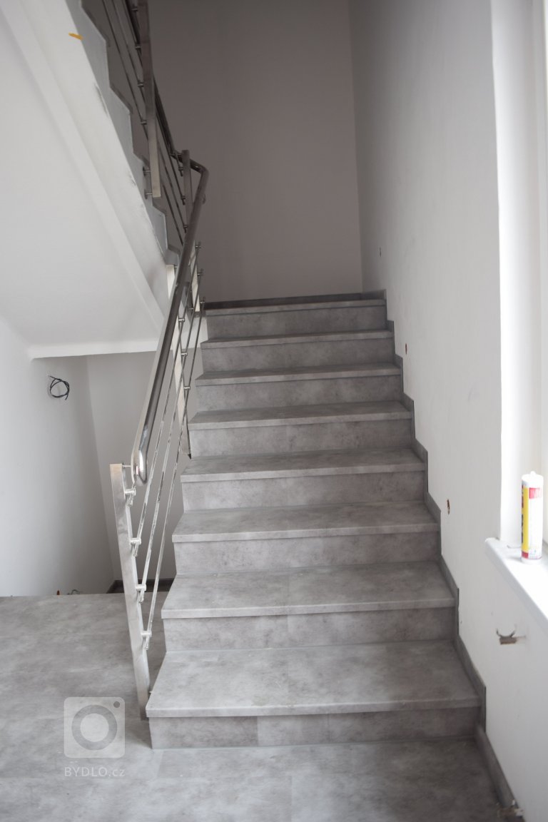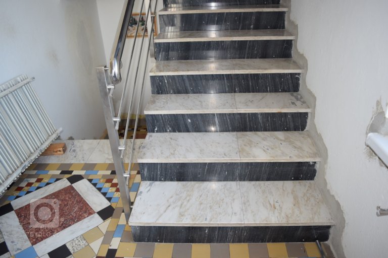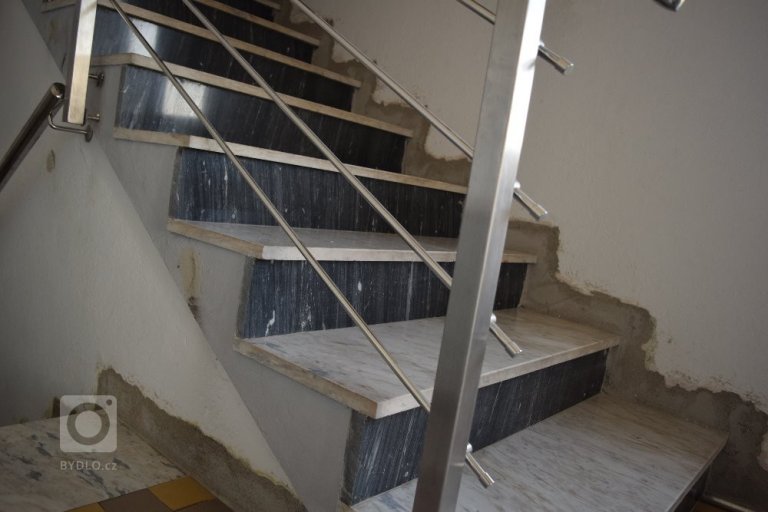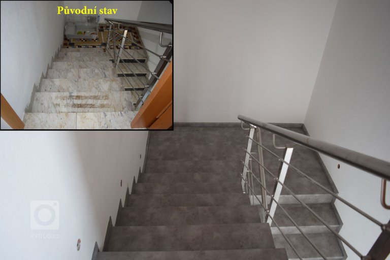 Ukázka renovace mramorových schodů s použitím vinylové podlahy BUKOMA STONE CLICK – dekor Kámen šedý Vinylové dílce jsou instalovány přímo na mramor bez použití kovových schodových hran. Mimo estetického vzhledu bylo dosaženo výrazného "oteplení" schodiště. Vinylová podlaha je pro dotyk s bosou novou výrazně teplejší a příjemnější než studený mramor.