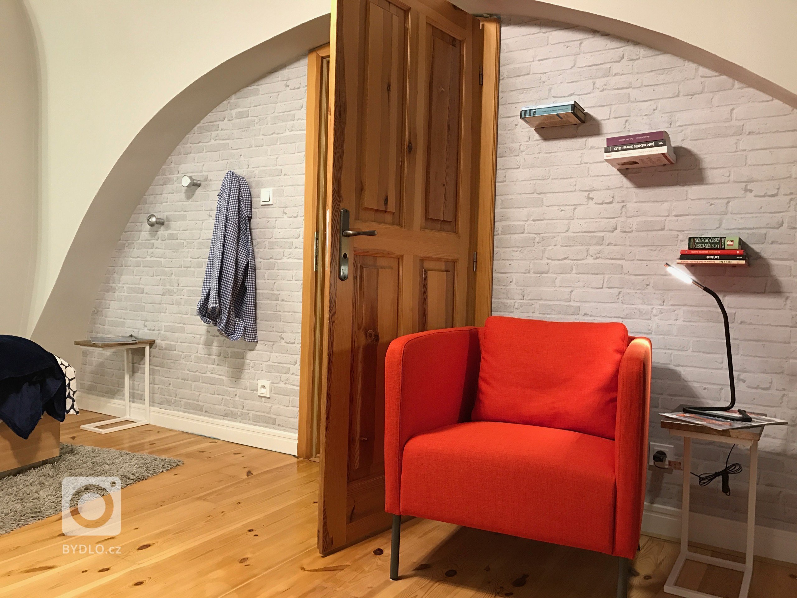 Levitující poličky na knihy a věšáky ve tvaru šroubu oživují výklenek s tapetou s motivem cihly.