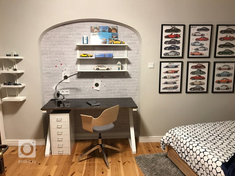Pracovní stůj je vyroben na míru dle mého návrhu. Má kovovou podnož a desku ze stavební překližky nalakovanou ve vysokém lesku.