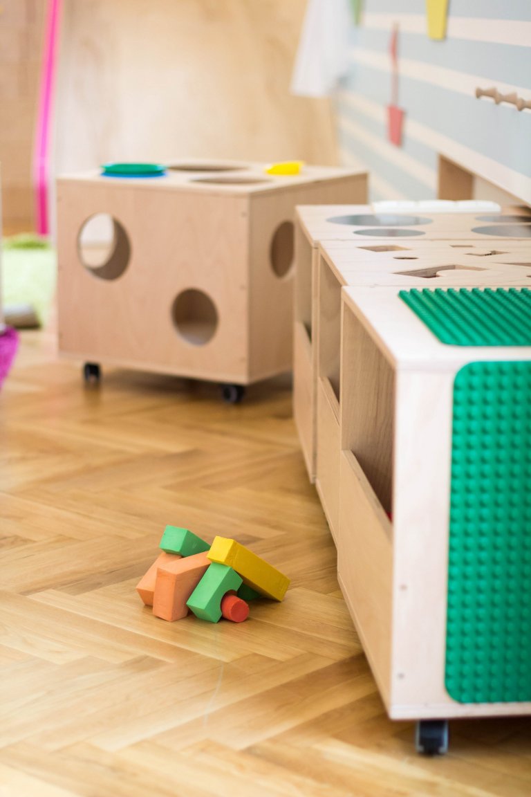 Náš cíl nebyl snadný – vytvořit prostor pro děti od batolecího věku až po mladší teenagery tak, aby jejich maminky mohly nerušeně popíjet kávu. Takže nás čekala výzva v podobě multifunkčních prvků, se kterými si vyhraje široké spektrum dětí podle své fantazie. Jako základní motiv jsme využili geometrický tvar trojúhelníku a celou hernu jsme rozdělili do několik zón. Vznikla tak zóna přezouvání, kuchyňka, experimentální laboratoř, aktivní zóna a posezení pro rodiče.