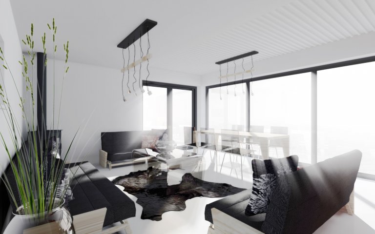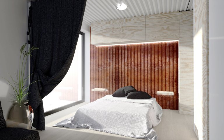 Investoři si koupili 2 lodní kontejnery, ve kterých si vytvořili letní chatu. Při návrh dispozice jsme se snažili využít maximální výhledy ven a zároveň navrhnout maximálně velký obývací pokoj a v zadní části ložnici, která by mohla být v případě návštěvy rozdělena na 2 pokoje. Uvnitř domu pak byla navržena koupelna. V interiéru jsme se snažili ponechat plechové plochy viditelné, v některých částech je ponechán také rezavý vzhled interiéru. Rezavé plochy jsme doplnili kombinací průhledných materiálů a světlé překližky.